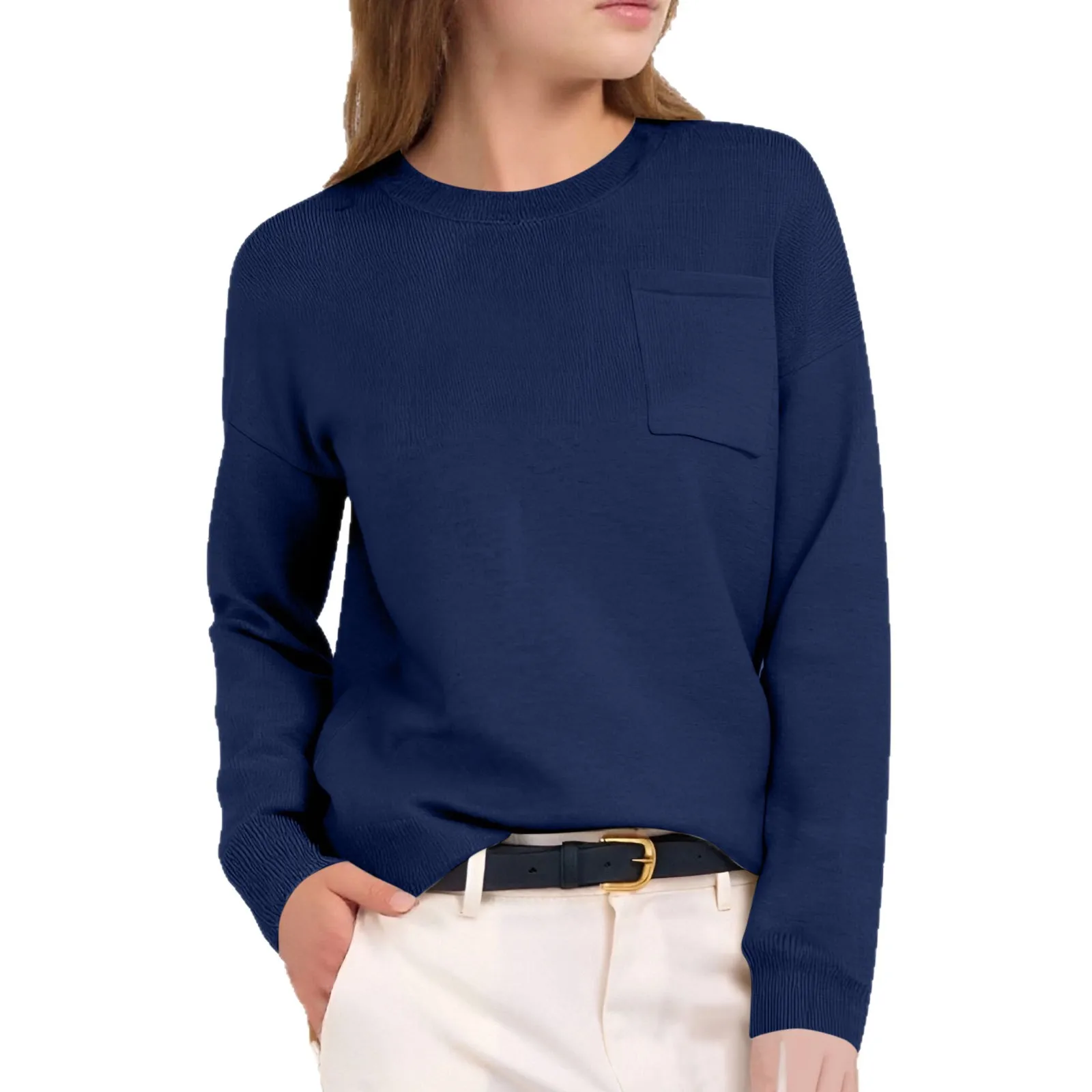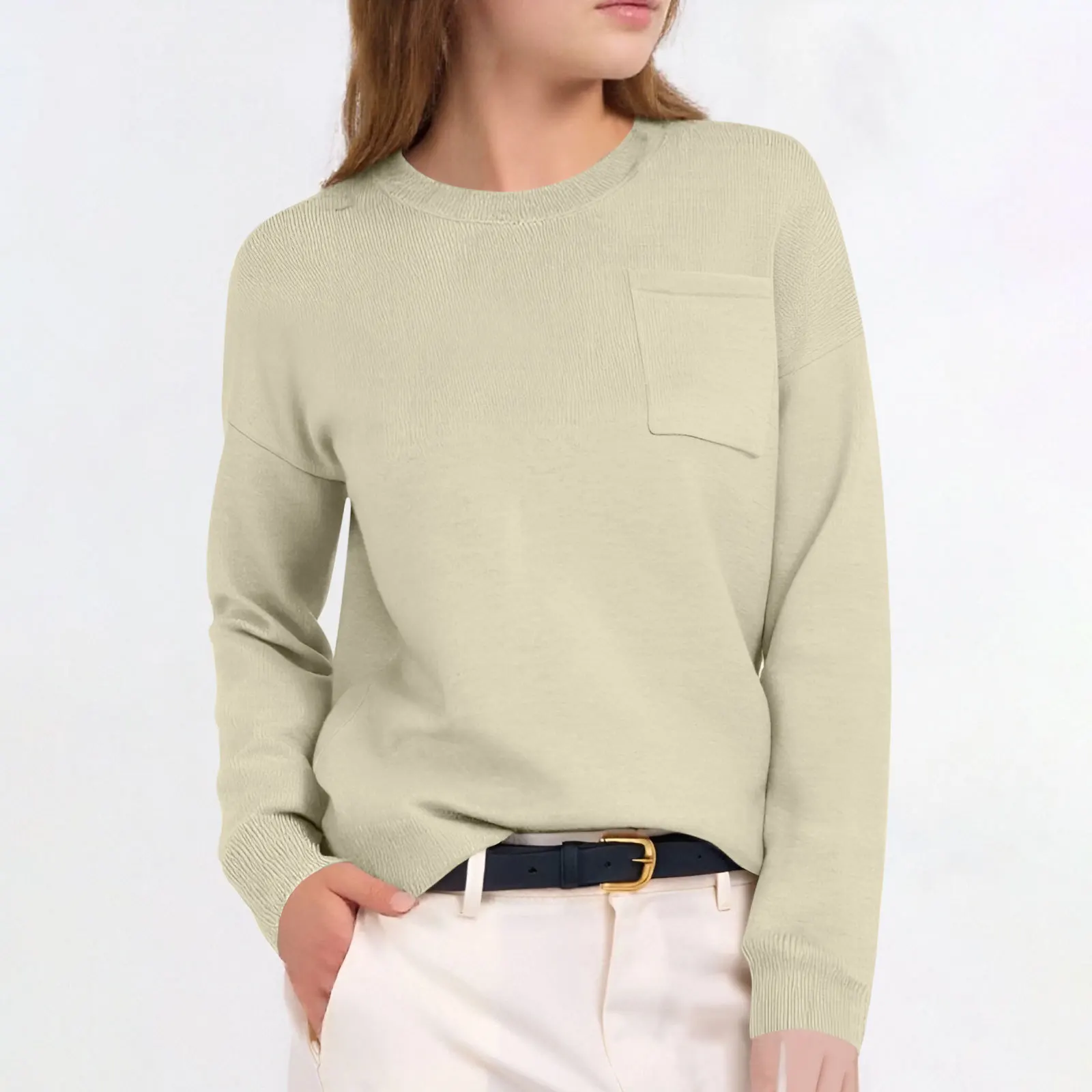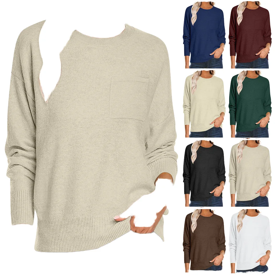 European American Women's Casual Solid Color Korean Long Sleeve Pullover Sweater Pocket for Amazon Women's Autumn/Winter Knitted