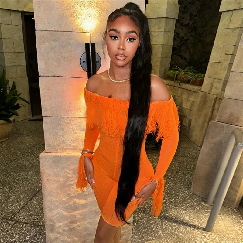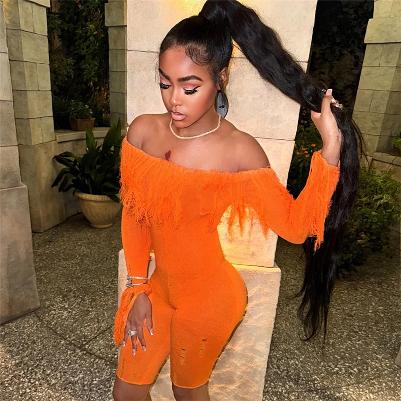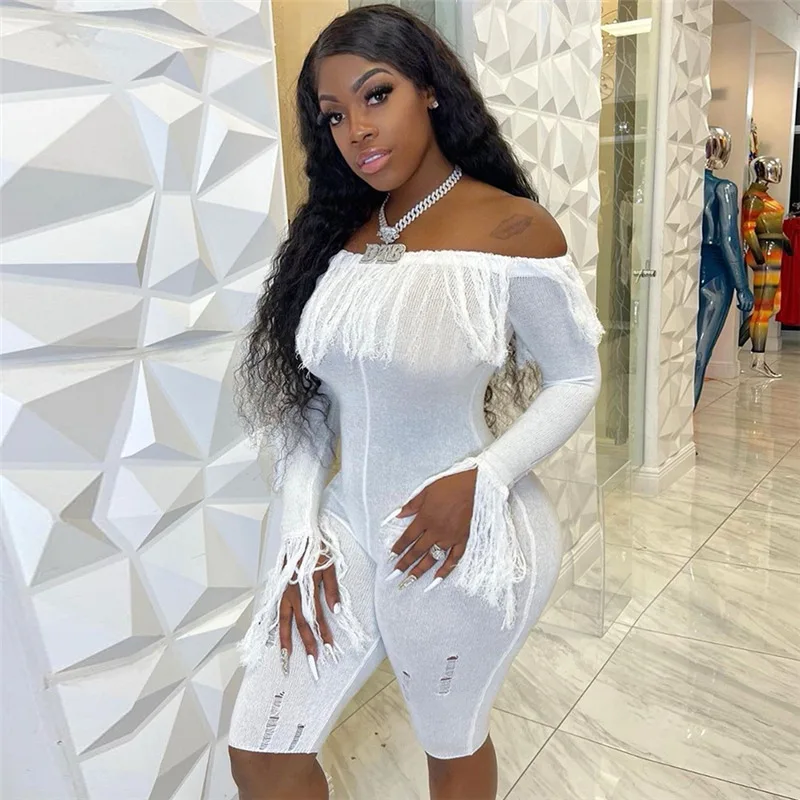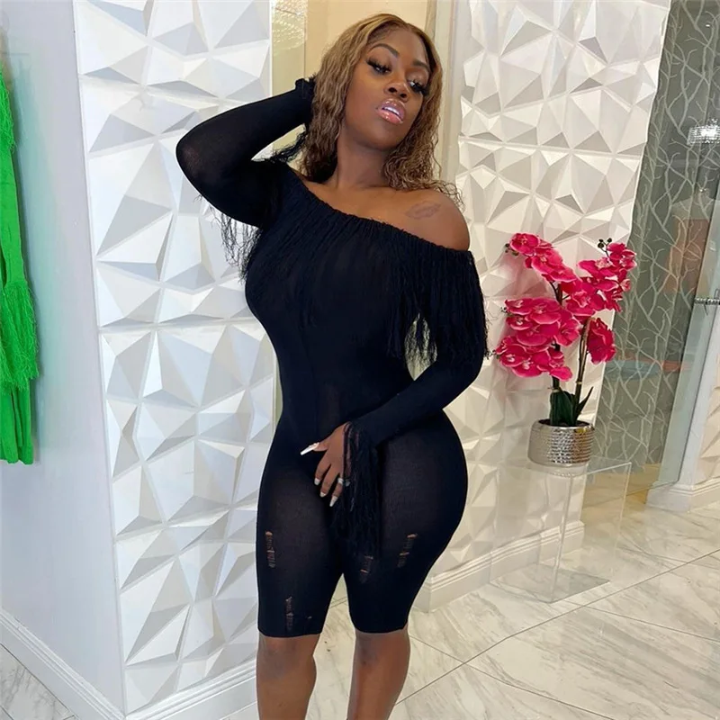 JY W24Q48572 Summer 2024 off Shoulder Long Sleeve Jumpsuit One Piece Solid Skinny Tassel Sexy Hollow Out Jumpsuit for Women