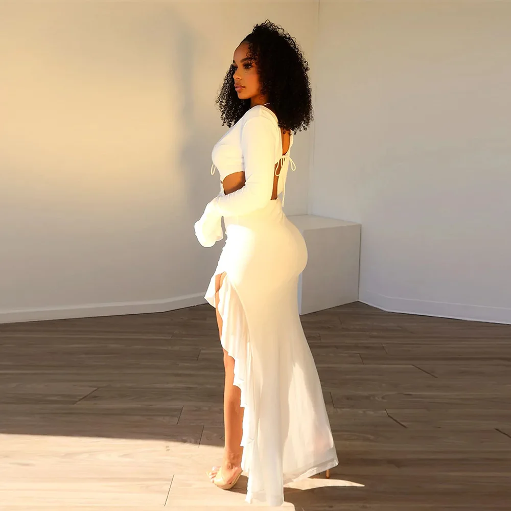 JY New Summer Women's Sexy Dress Street Long Sleeve V-neck Lace-up Long Dress Ruffled Asymmetric Dress for Women