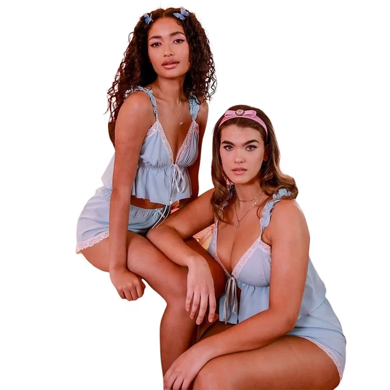 J Summer Women's Two Pieces Set Sleeveless Backless Deep V-neck Bandage Crop tank Top Lace Shorts for Women Lady