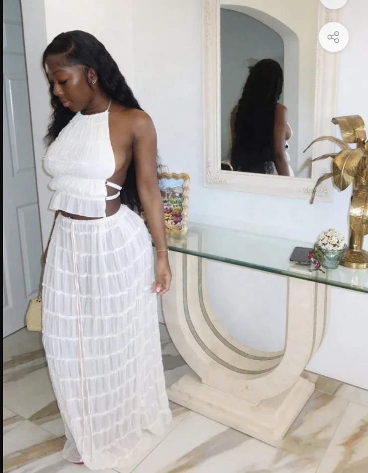 JY Summer 2024 New Women Two Piece Skirt Suit Sexy Halter Pleated Backless Lace Crop Tops Long Dress Set Elegant Outfit