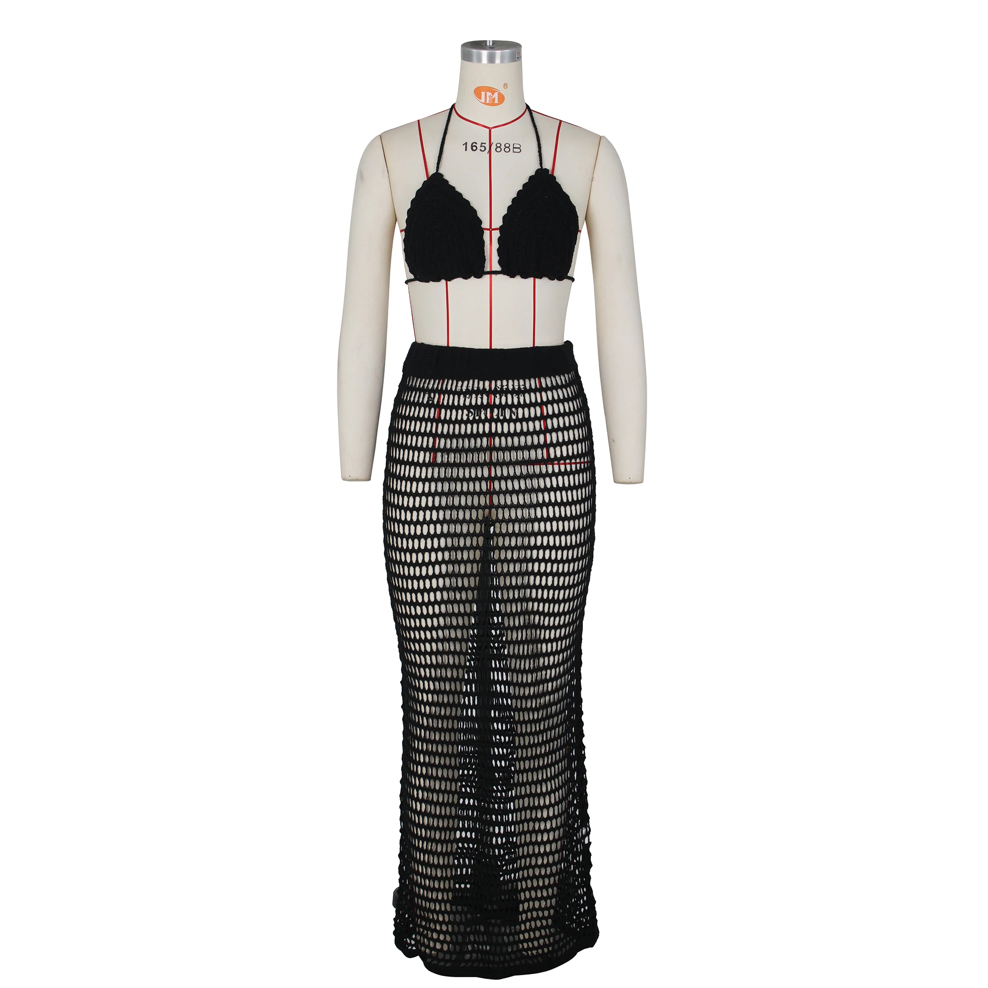 JY Summer Beach Wear Crochet Knitted Hollow Out Halter Top Bras and Long Knit Skirt Casual Sexy Two Pieces Skirt Set Women