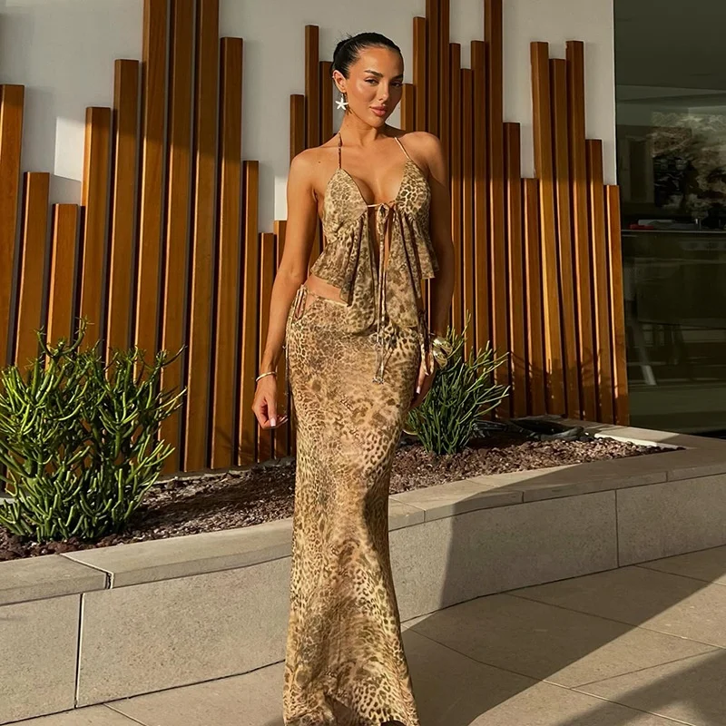 JY Summer 2024 LEOPARD PRINT Bandage Backless Tube tank Tops and Long Skirt Casual Elegant 2 Piece Set Women Outfit