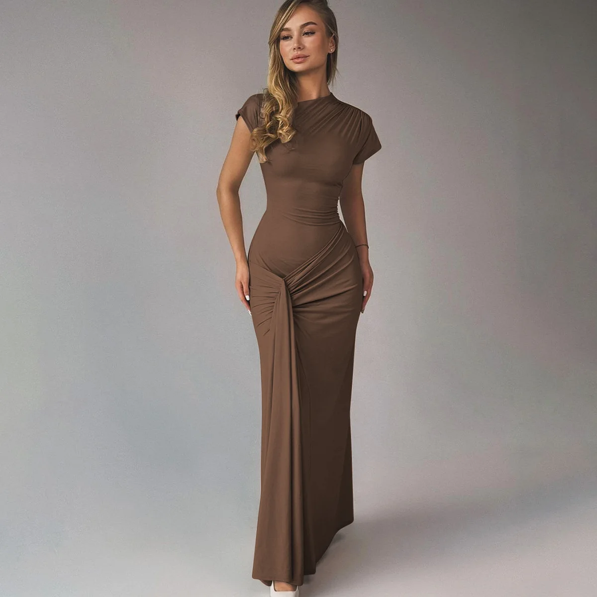 JY D4616748K Fall 2024 New Women's Fashion Dress Solid Elegant Dress Slim Pleated Lace-up Short Sleeve Maxi Dress for Women