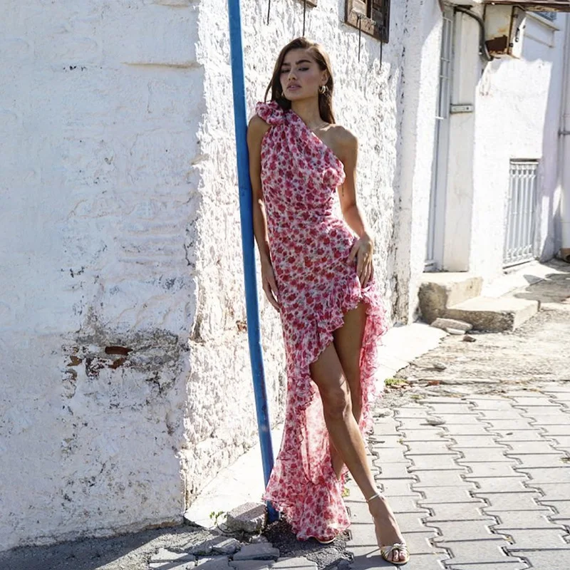 JY K24D50578 2024summer Print Floral Asymmetrical Dress for Women Sexy Sleeveless Halter Maxi Casual Elegant Dress Women Lady