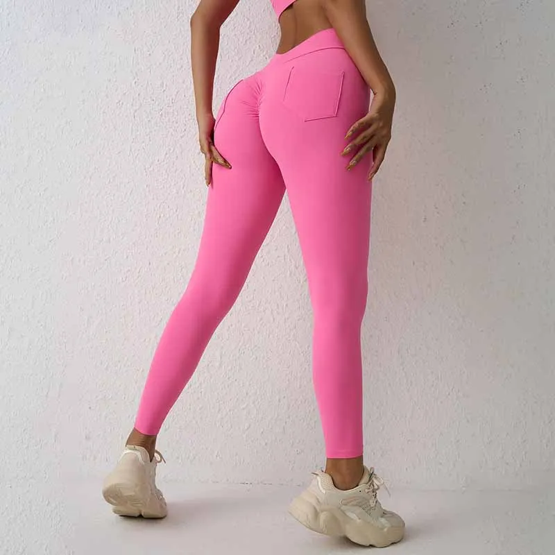 High Quality Women Sports Leggins Fitness V Waist Peach Hip Scunch Butt High Elastic Breathable Quick Drying Yoga Pants Pocket
