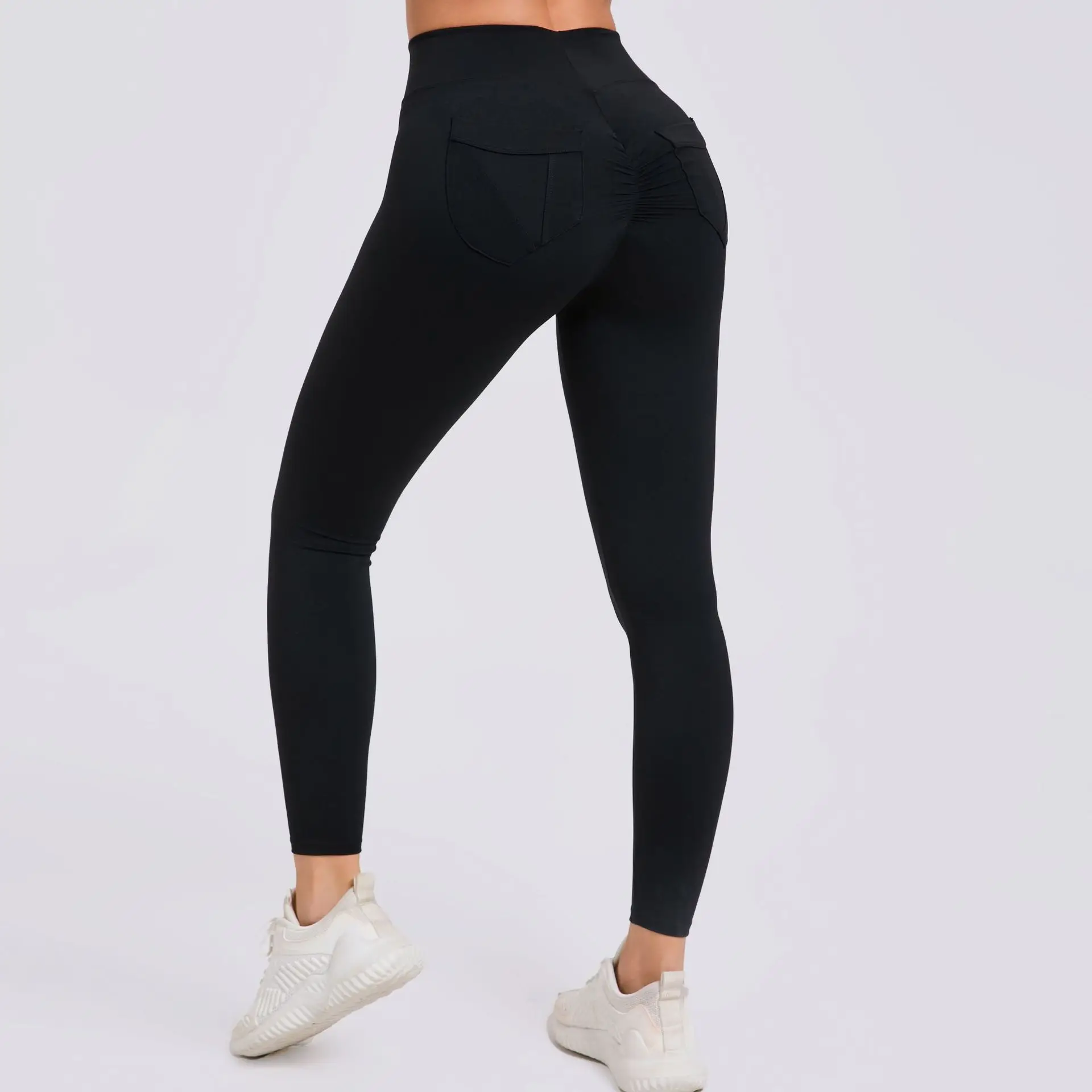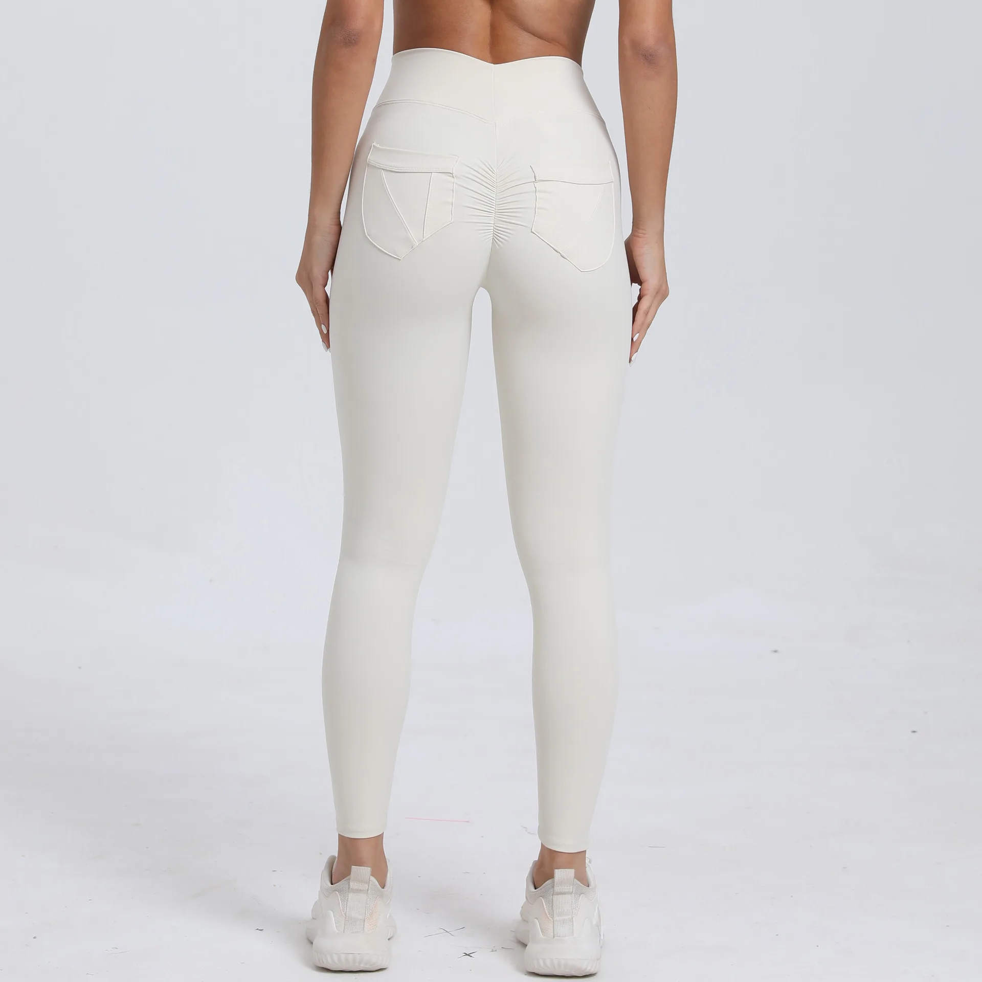 Women's Fitness Leggings Peach Butt Back Ruched Design Sexy V Waist Yoga Pants Breathable Spandex Sportswear Pockets Gym