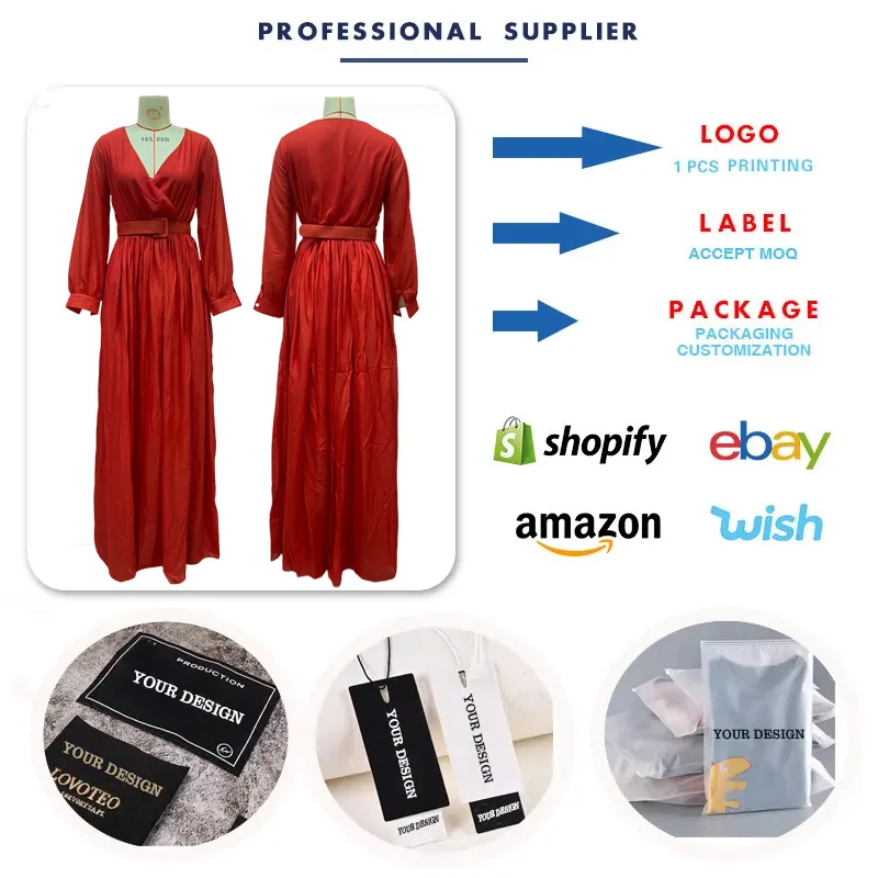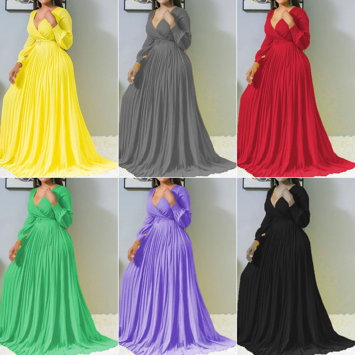 SC8033 Hot-selling Plus Size Dresses Women Casual Elegant Long Sleeve A-line V-neck Pleated Long Maxi Dress for Ladies With Belt