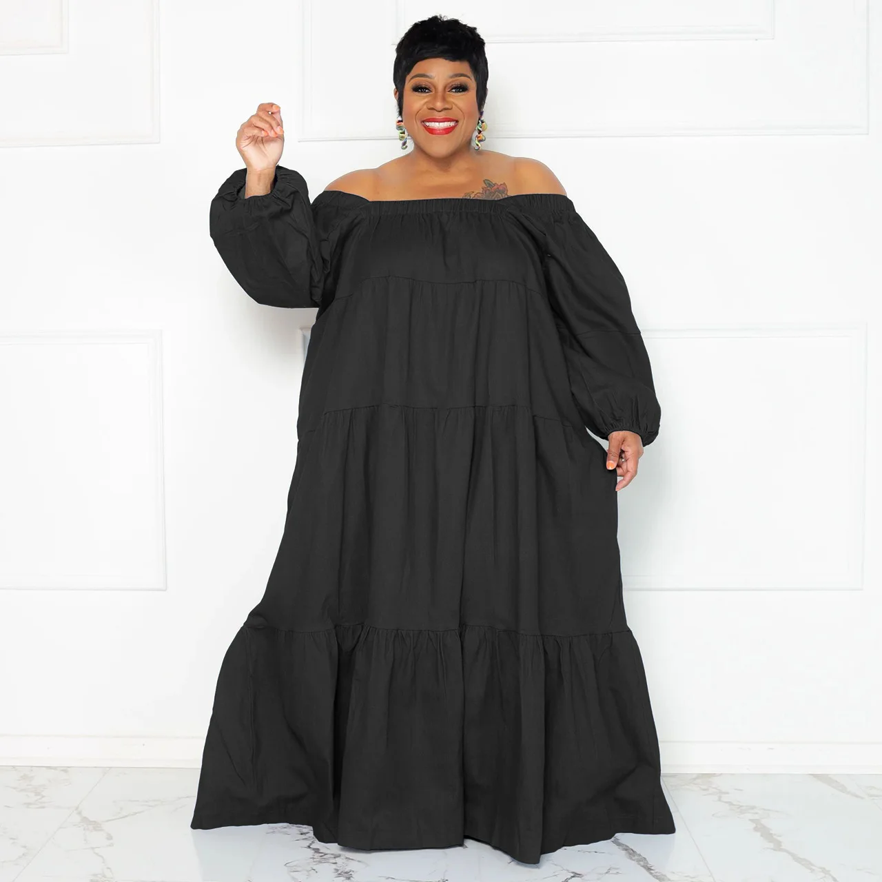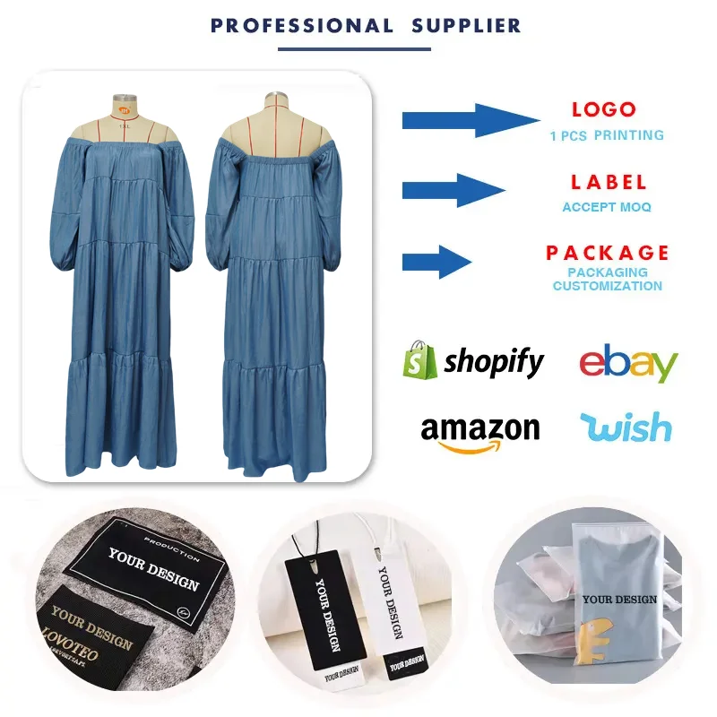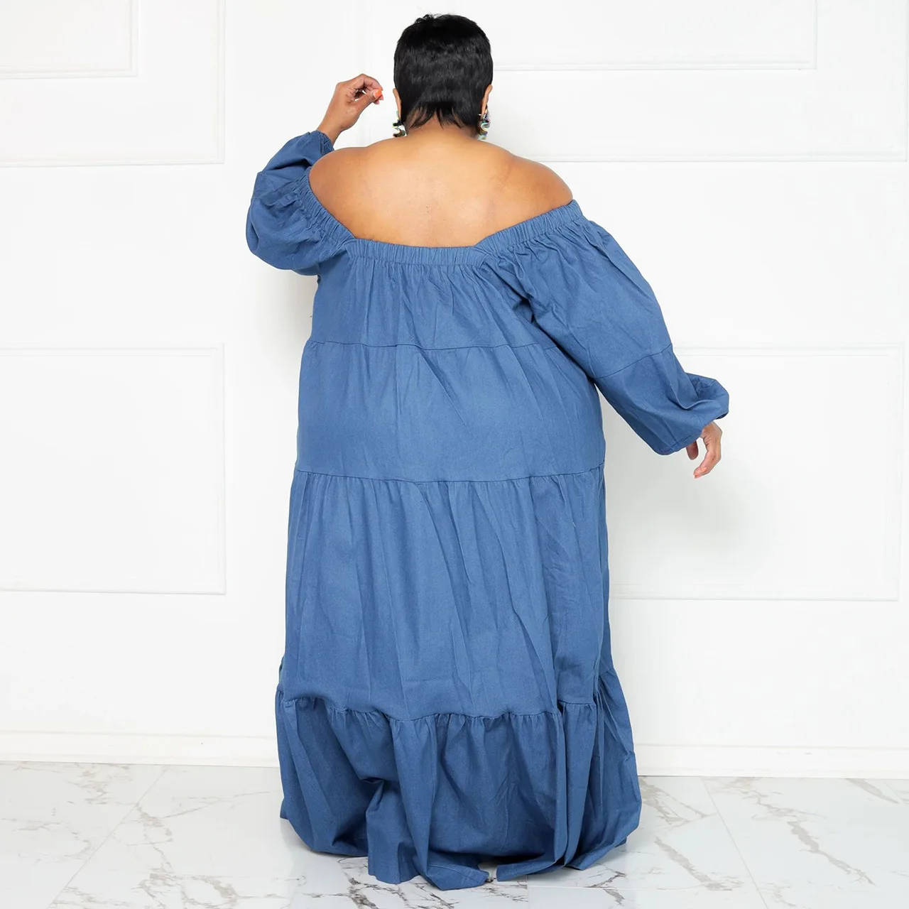 N7537 Trendy Autumn Plus Size Jeans Dresses Women Casual Soft Denim Fabric A-Line Ruffle Off-Shoulder Loose Maxi Denim Dress