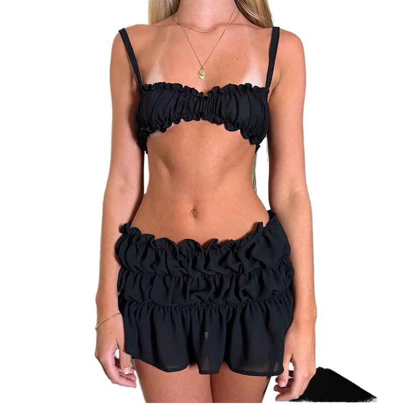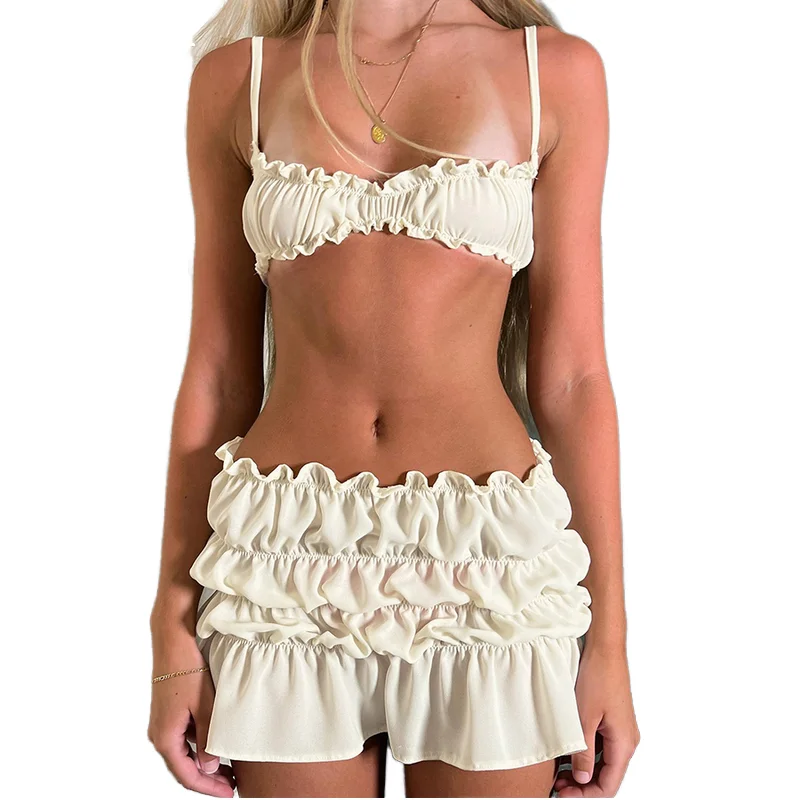 JY Z712ST 2024 Summer Matching Suit Ruched Ruffles Bra Top Camisole Short Pants Slim Fit Pleated Shorts Suspenders Set