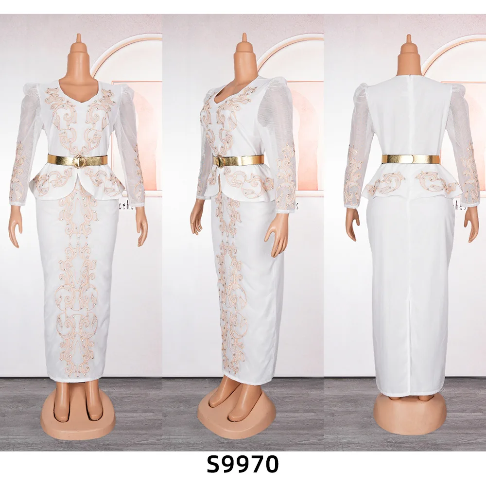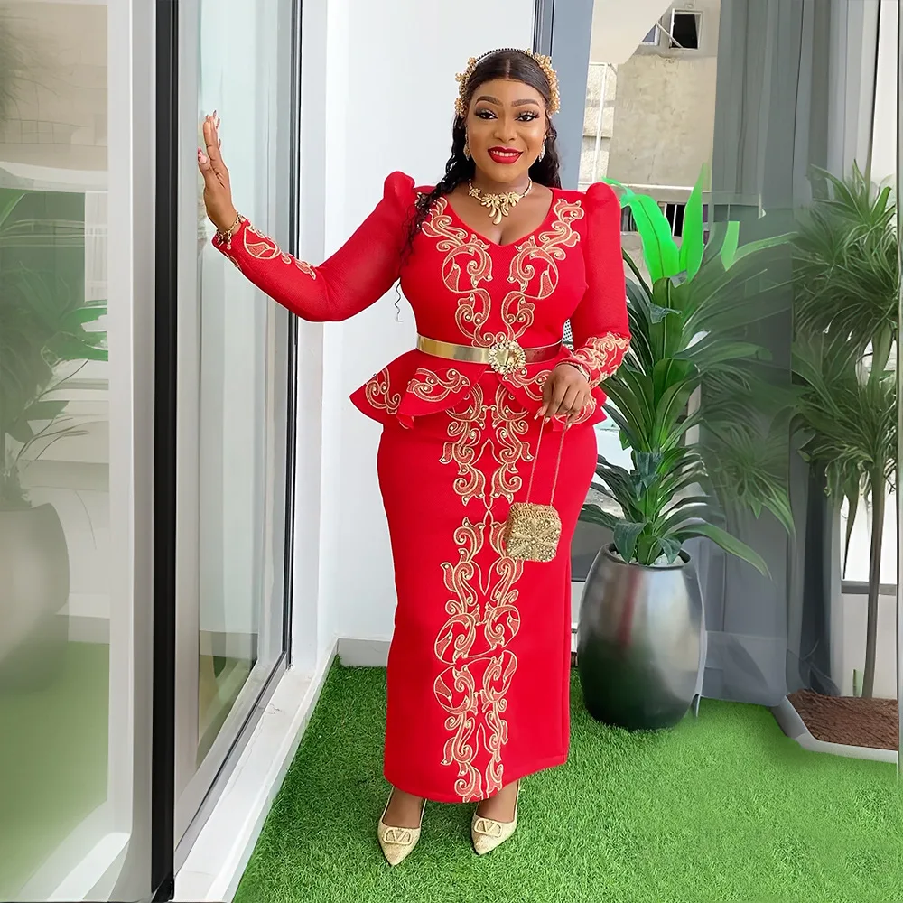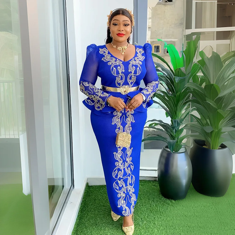 JY-1007 Luxury Plus Size Women Evening Dresses Long Sleeve Beaded Rhinestone V-neck African Church Dresses for Women