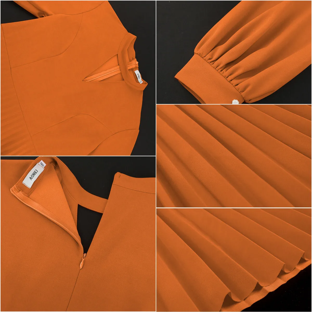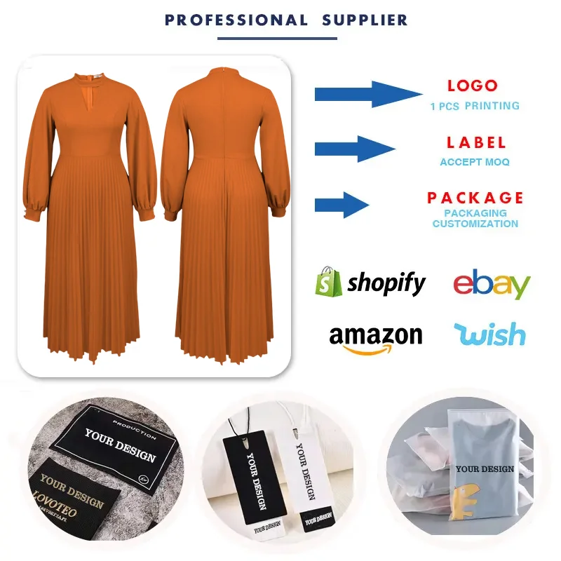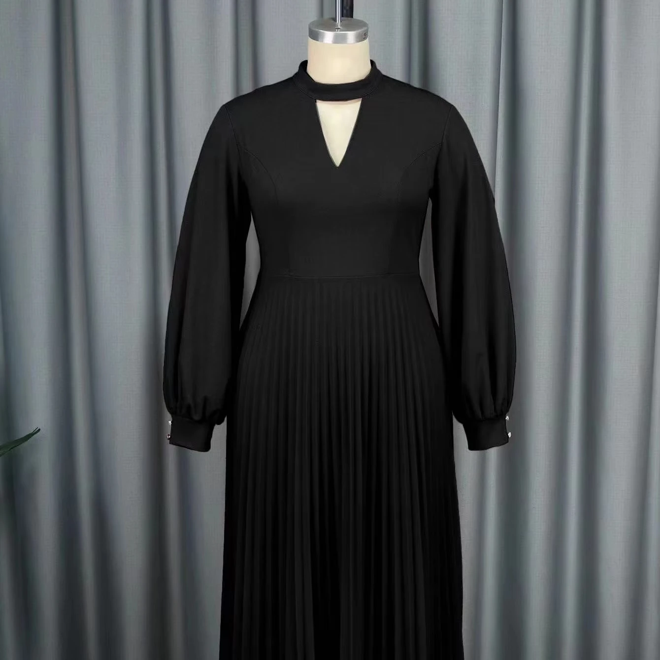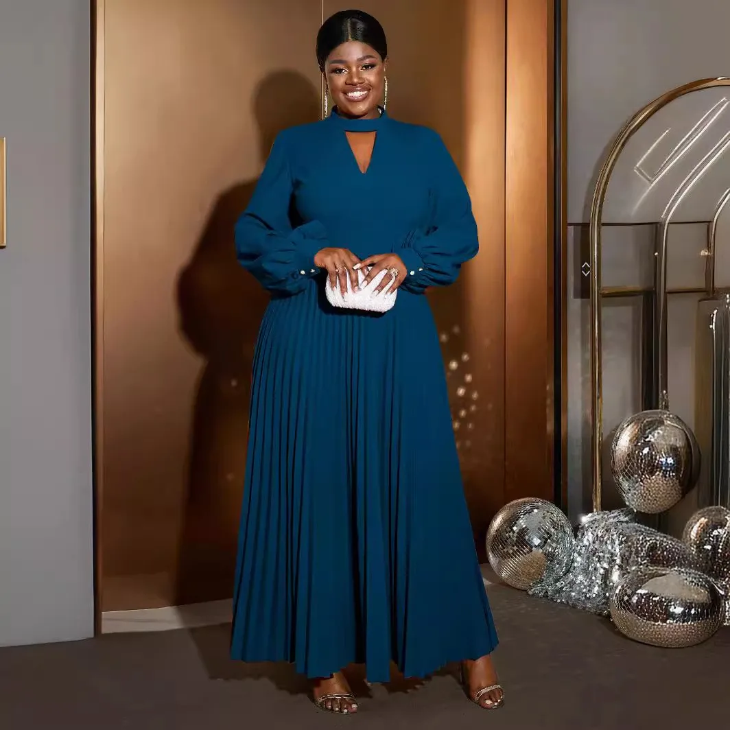 AM030920 Latest Design Casual Dresses Women Elegant Hollow Out Round Neck Lantern Sleeves Pleated Long Dresses Women Maxi Dress