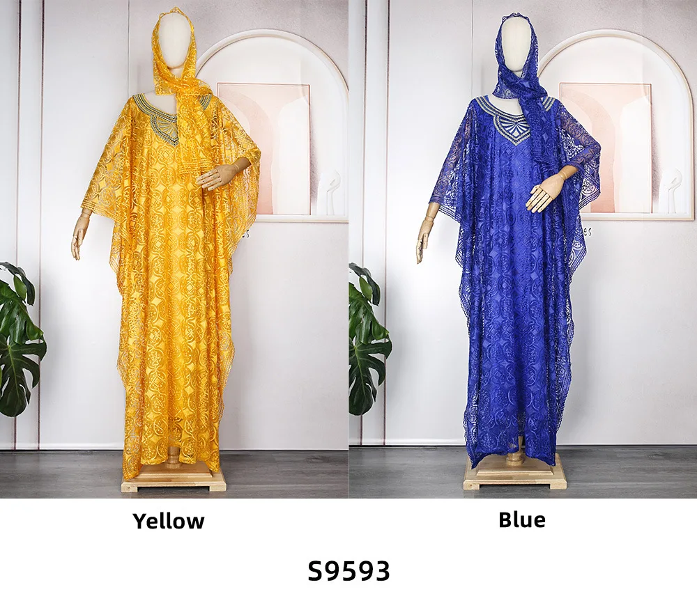 S9593 Trendy African Dresses for Women Clothing Embroidered Lace Loose Bat Sleeve Dress Tank Top Robe 3-Piece Set With Headscarf
