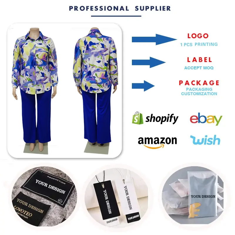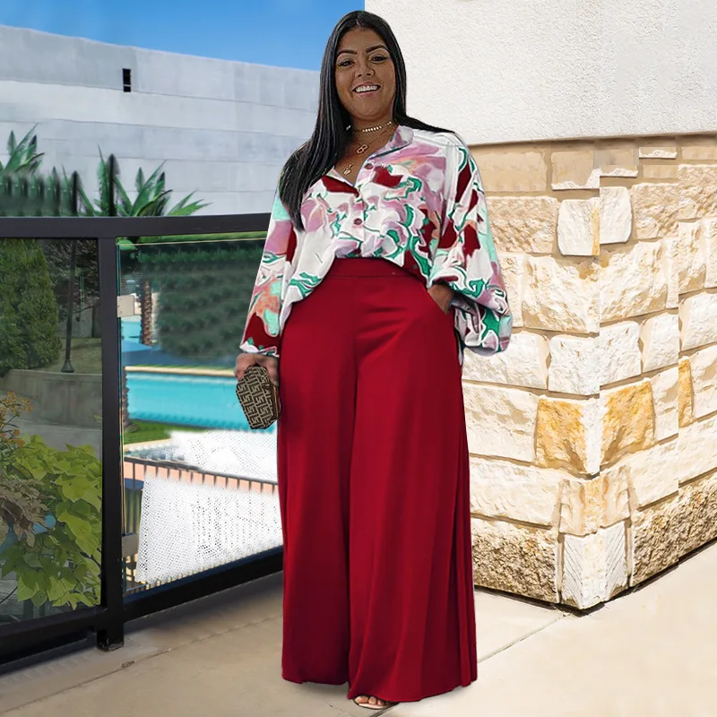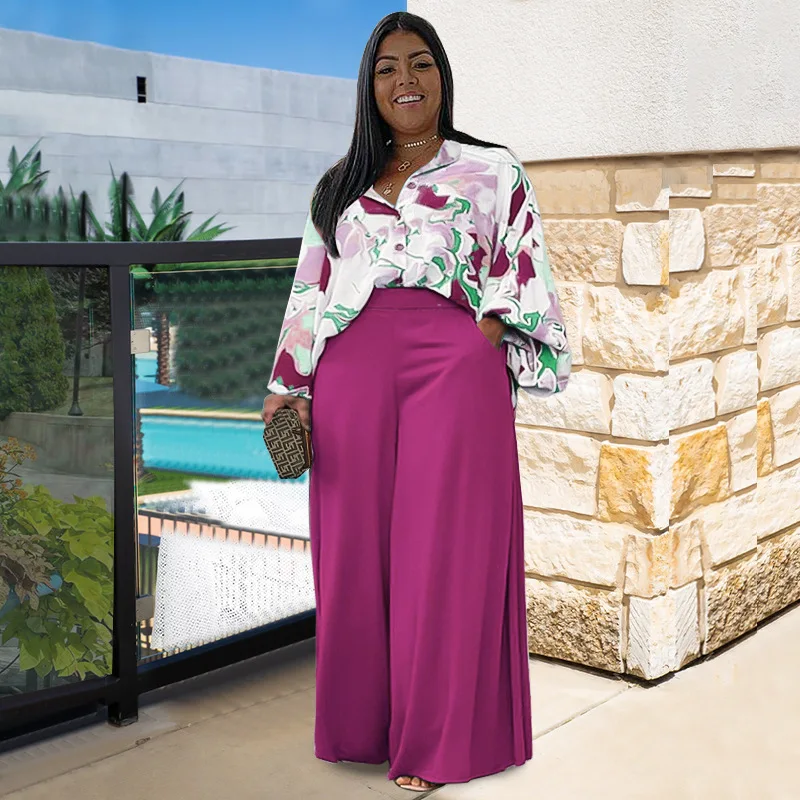N7761 Best-Selling Plus Size Women's Clothing Loose Casual Printed Shirt and Wide Leg Pants Set 2 Pieces Fall Outfits for Women