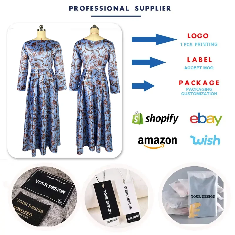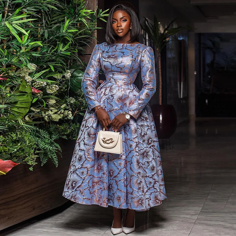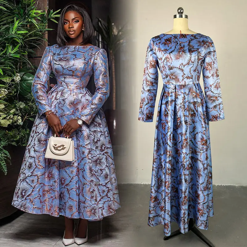 HK7305 Latest Design Autumn Women Casual Dresses Elegant O-Neck Long Sleeve A-Line Long Dresses Women Ruched African Dresses