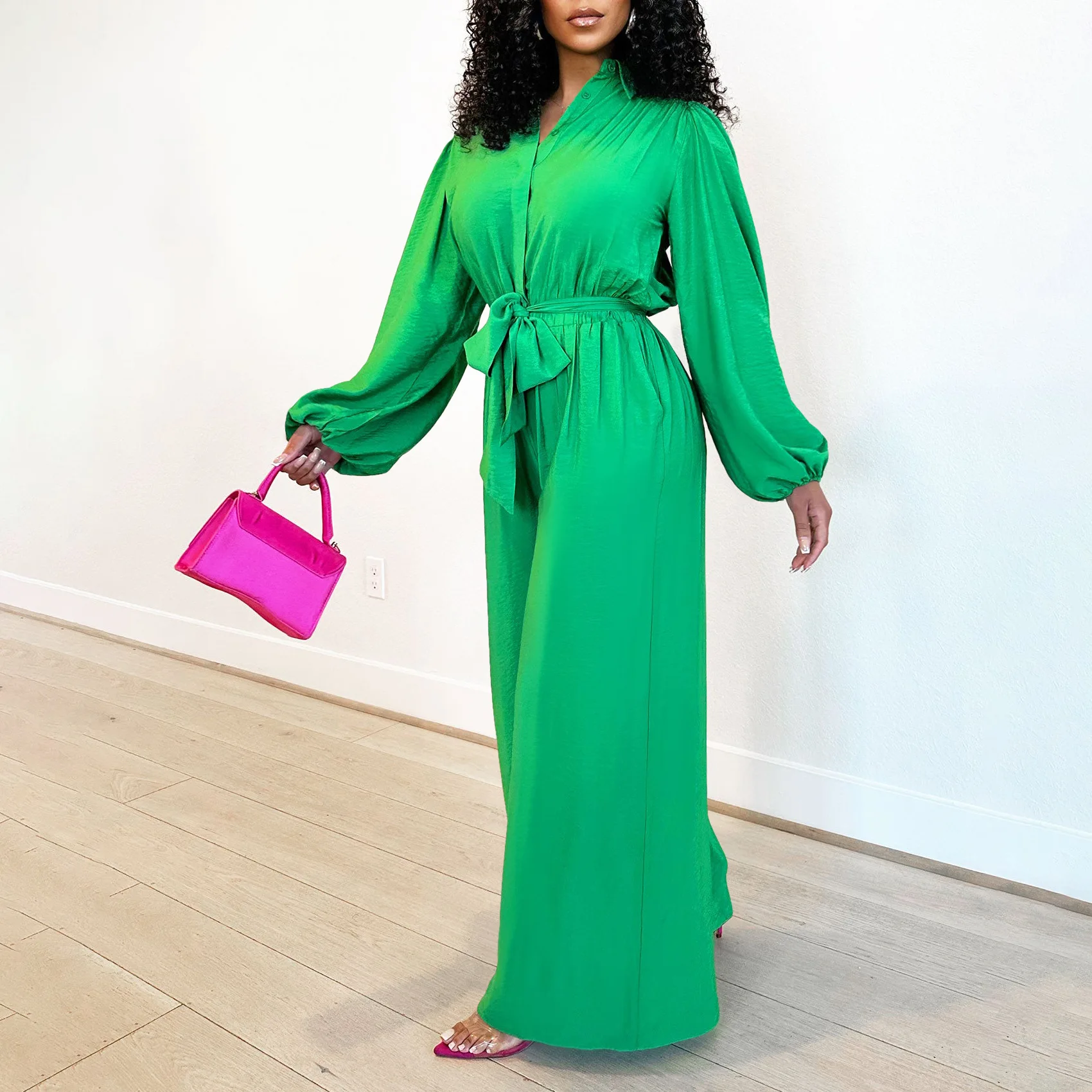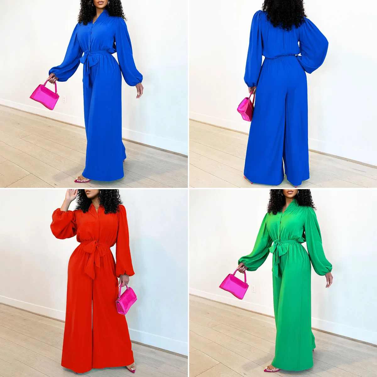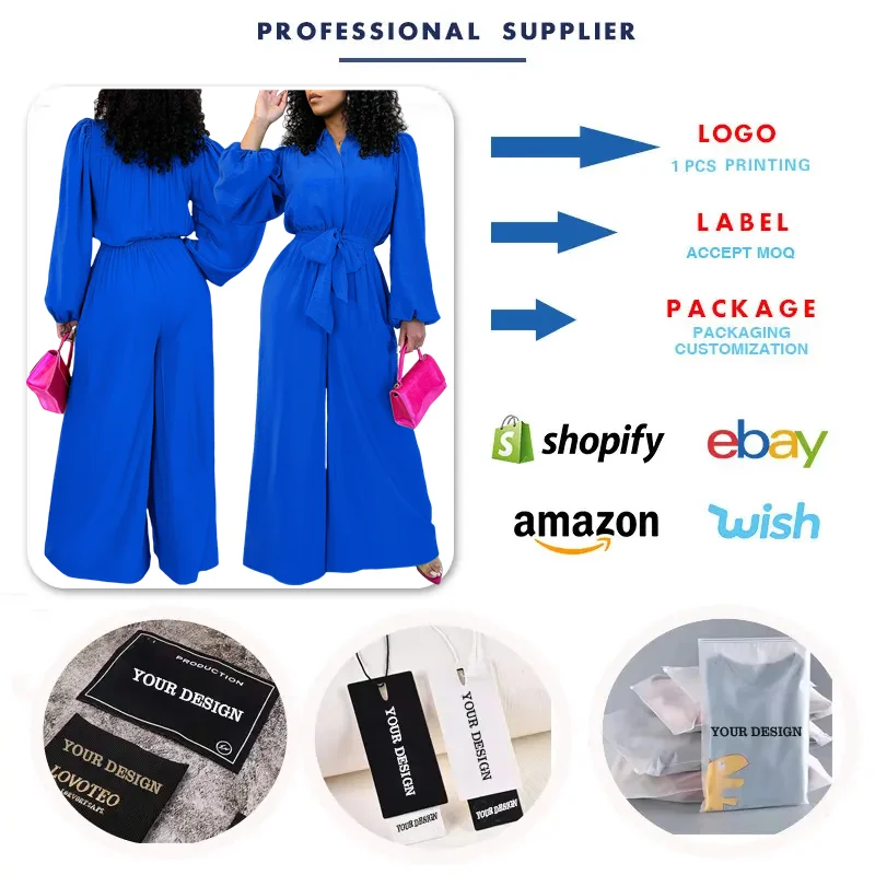 C8596 Latest Design Autumn Jumpsuit Women Elegent Long Sleeve Solid Color High Waist Loose Wide Leg Jumpsuit for Ladies