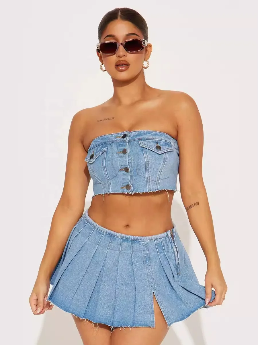 JY New Fashion Women's Two Piece Denim Suit Street Trendy Strapless Button Corset Split Pleated Skirt Jeans Suit Women