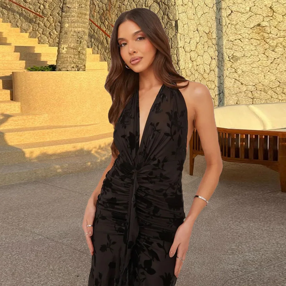 JY Summer New Women's Mesh Dress Hollow Out Sexy Backless Ruffled Flocking Maxi Dress Party Prom Dress for Women