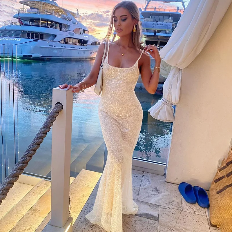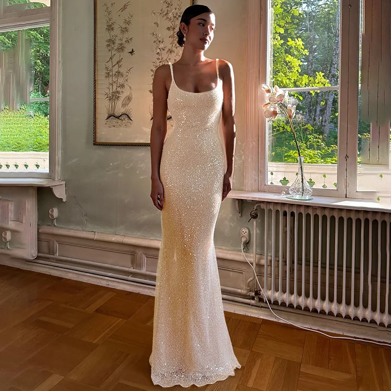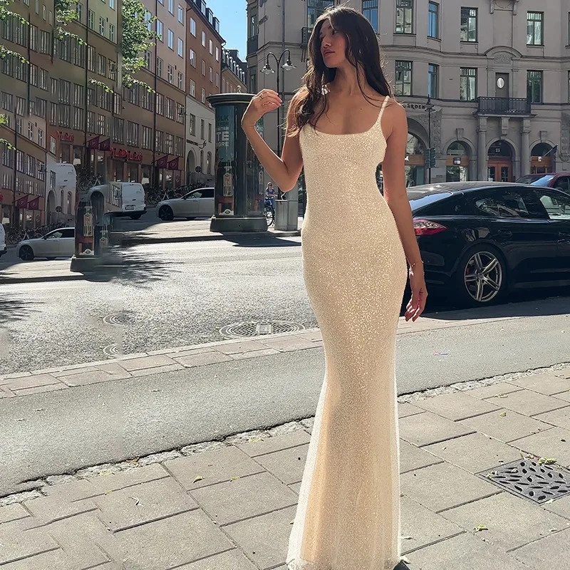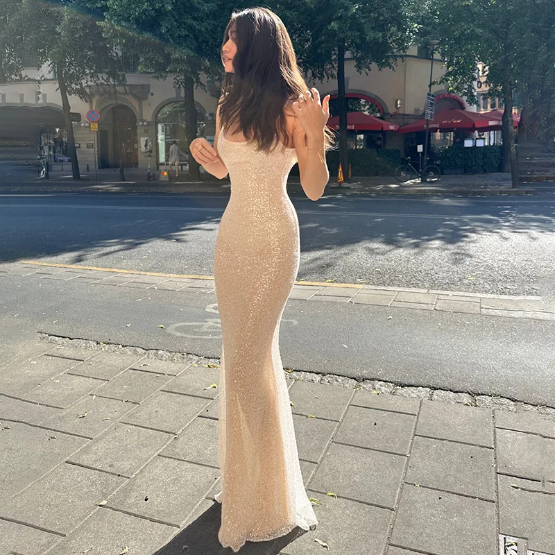 JY Summer 2024 New Sequined Sleeveless Fish Tail Maxi Cami Dress Solid Bodycon Sexy Elegant Evening Dress for Women
