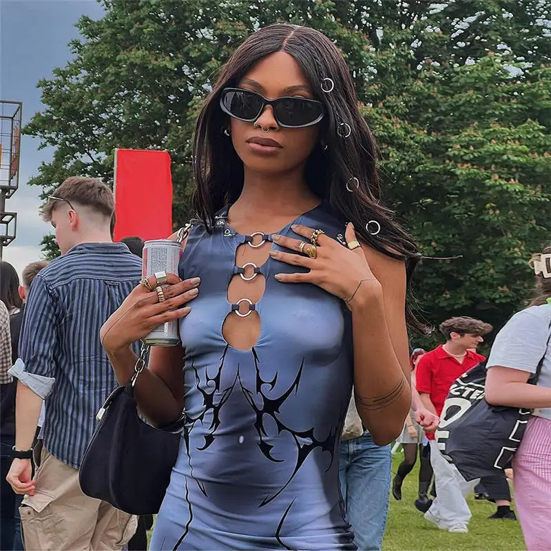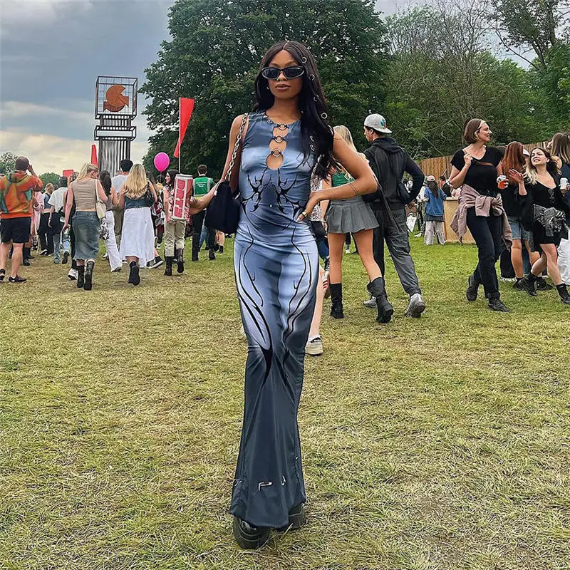 JY Z705DS Sleeveless Summer Print Crew Neck Women's Lady Women Elegant Party Maxi Bodycon Hollow Out Loops Dress