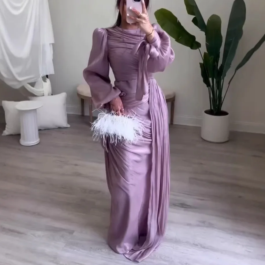 Bettergirl Middle Eastern 2026 Ramadan Hot-selling Fashion Slim purple Long Dress Pleat Mesh Long Sleeve Elegant Evening Dress