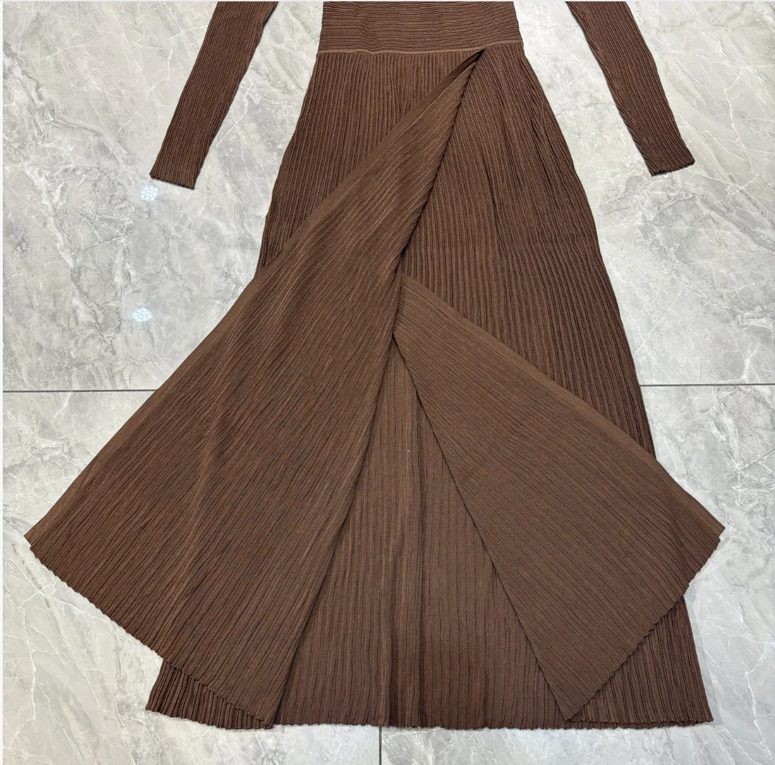 ZYHT 73849 European Wholesale Fashion Casual One Shoulder Ruched Maxi Dress Side Slit Pleated Long Sleeve Dresses for Women