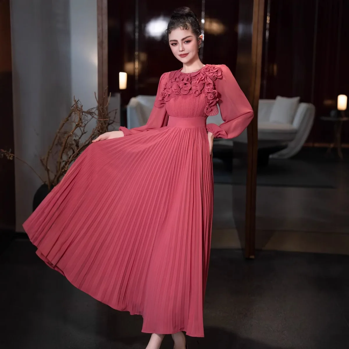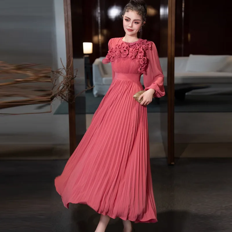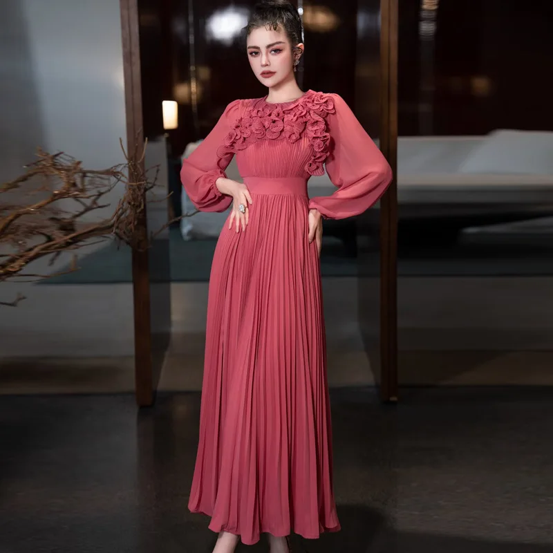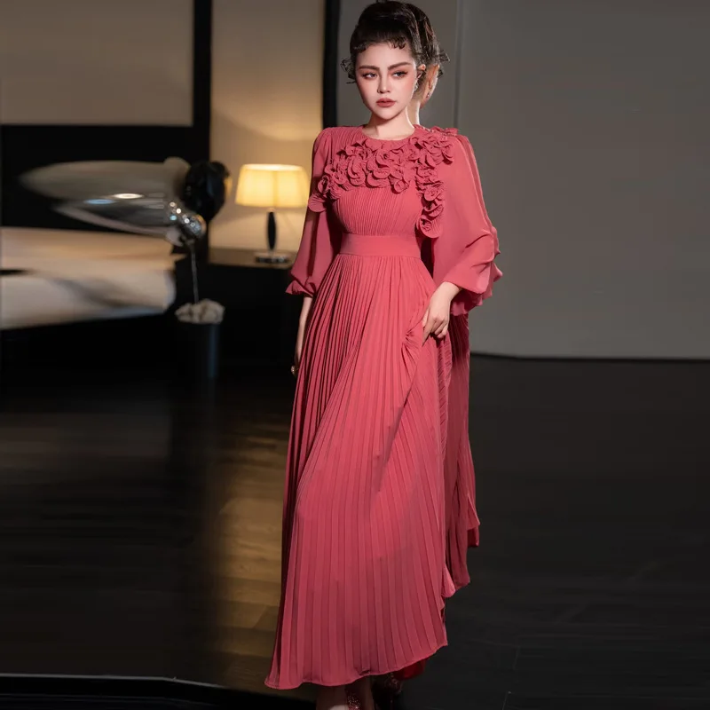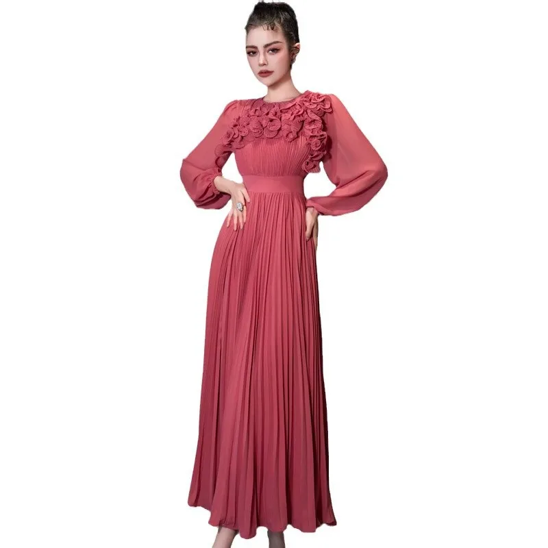 Fashion Luxury 2025 Ramadan 3D Flower Lantern Long Sleeve Solid Color Elegant Evening Dress Round Neck Pleated Long Women Dress
