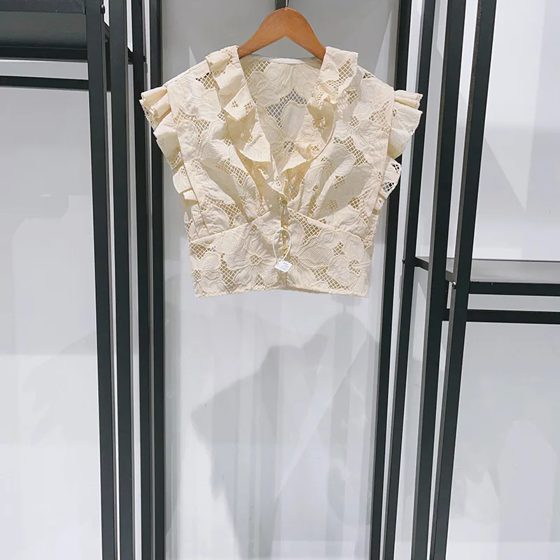 ZYHT 82024 White Blouse with Ruffled Cap Sleeves V-Neck Blouses Et Chemises Pour Femmes White Blouses for Women
