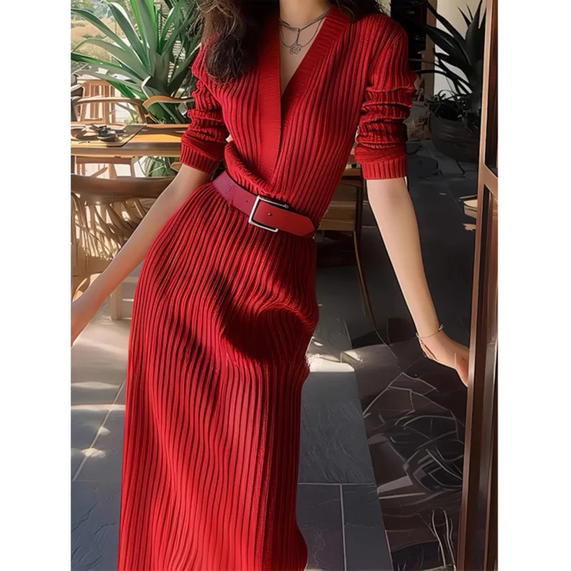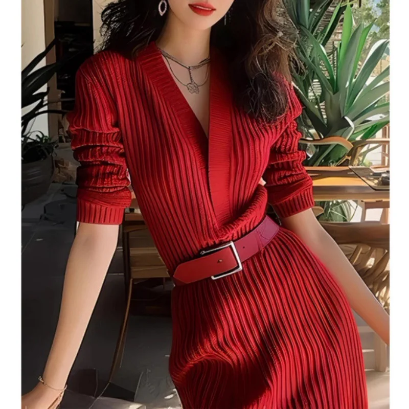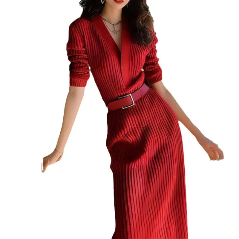 Autumn Winter Latest Design Women Fashion V-Neck Bodycon Knitted Women Elegant Casual Midi Dresses