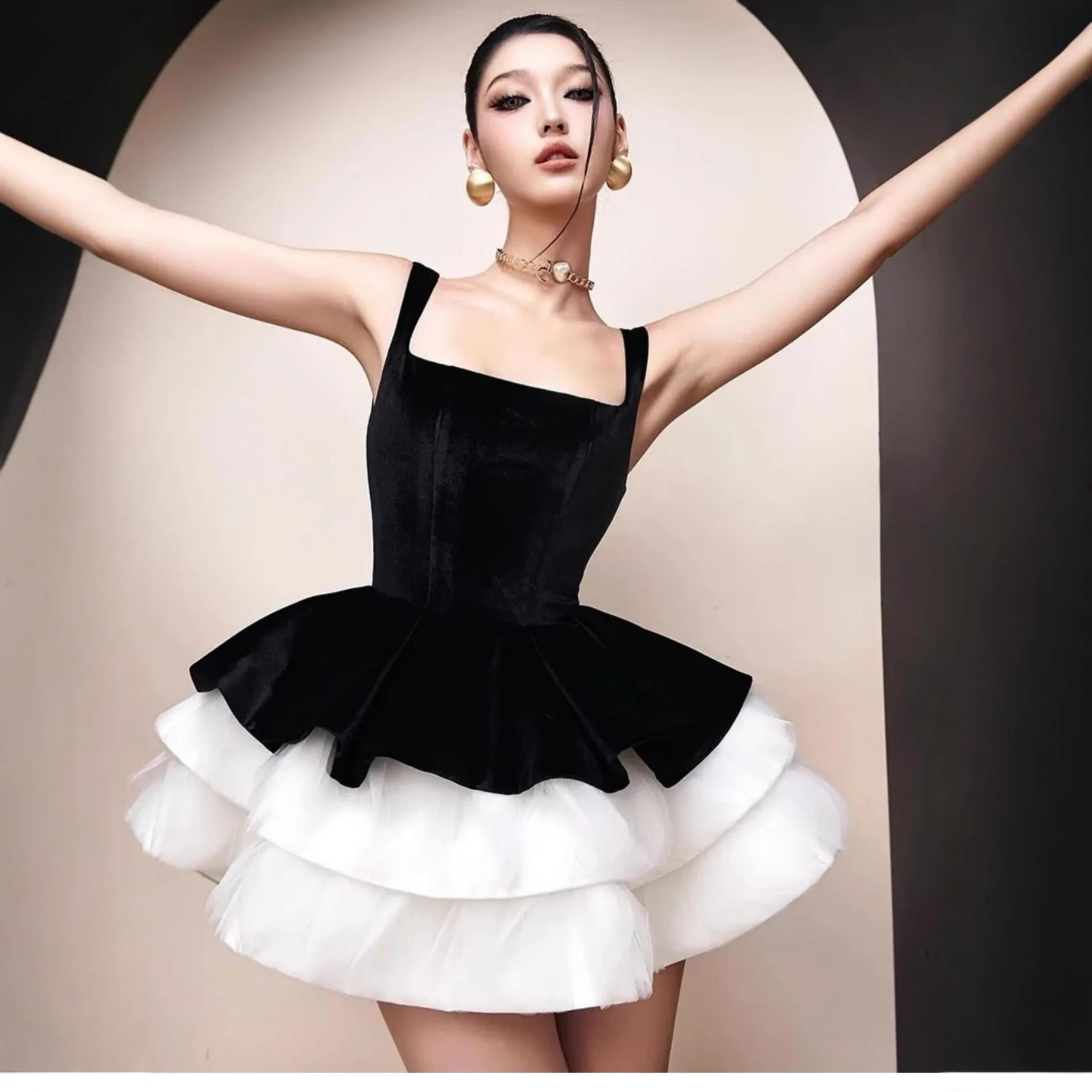 New Design Elegant French Hepburn Style Velvet Patchwork Slip Slim Fit Short Dress for Party