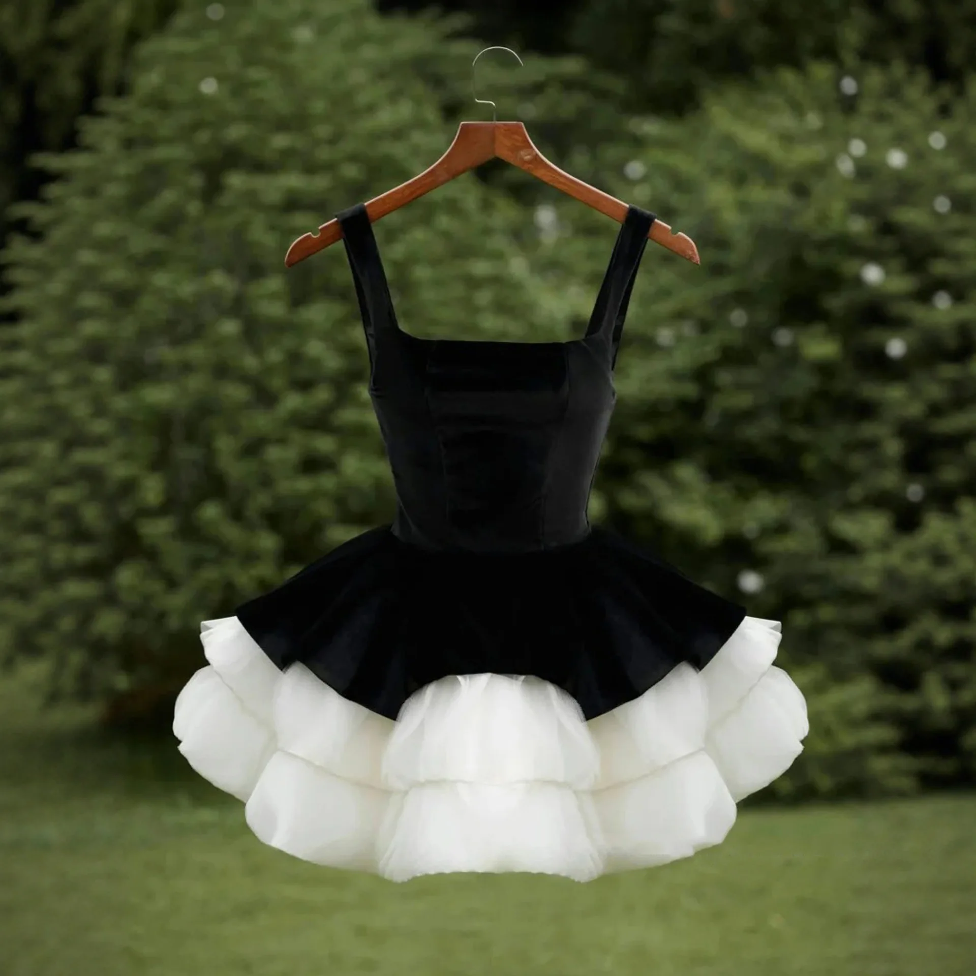ZYHT 21938 Black Velvet Mini Dress Square Neck Long Puff Sleeves with Pearl Trim & Crystal Dess Flared Scalloped Hem Dresses