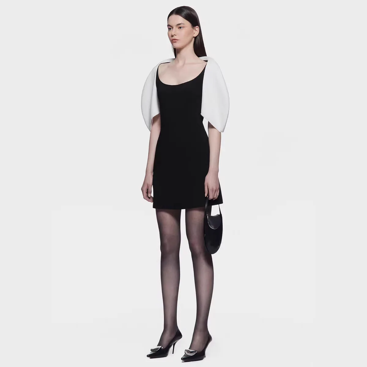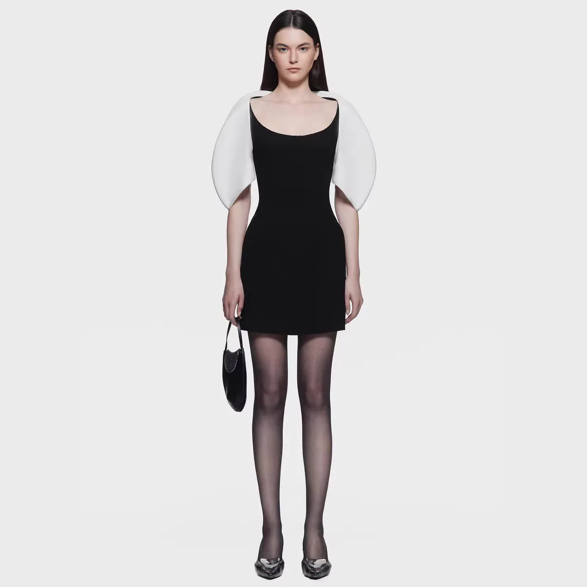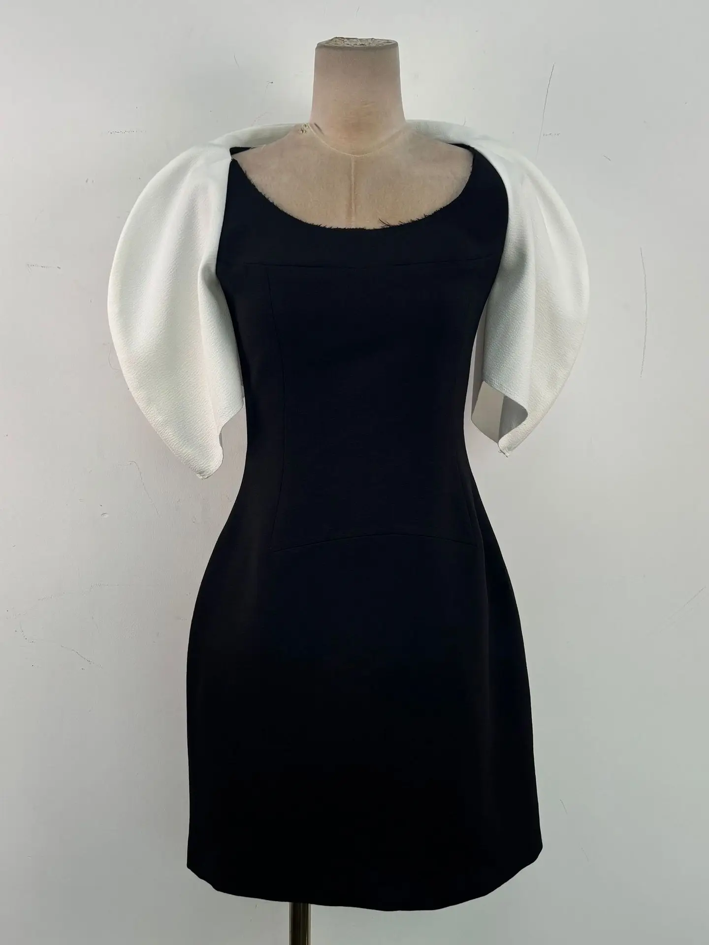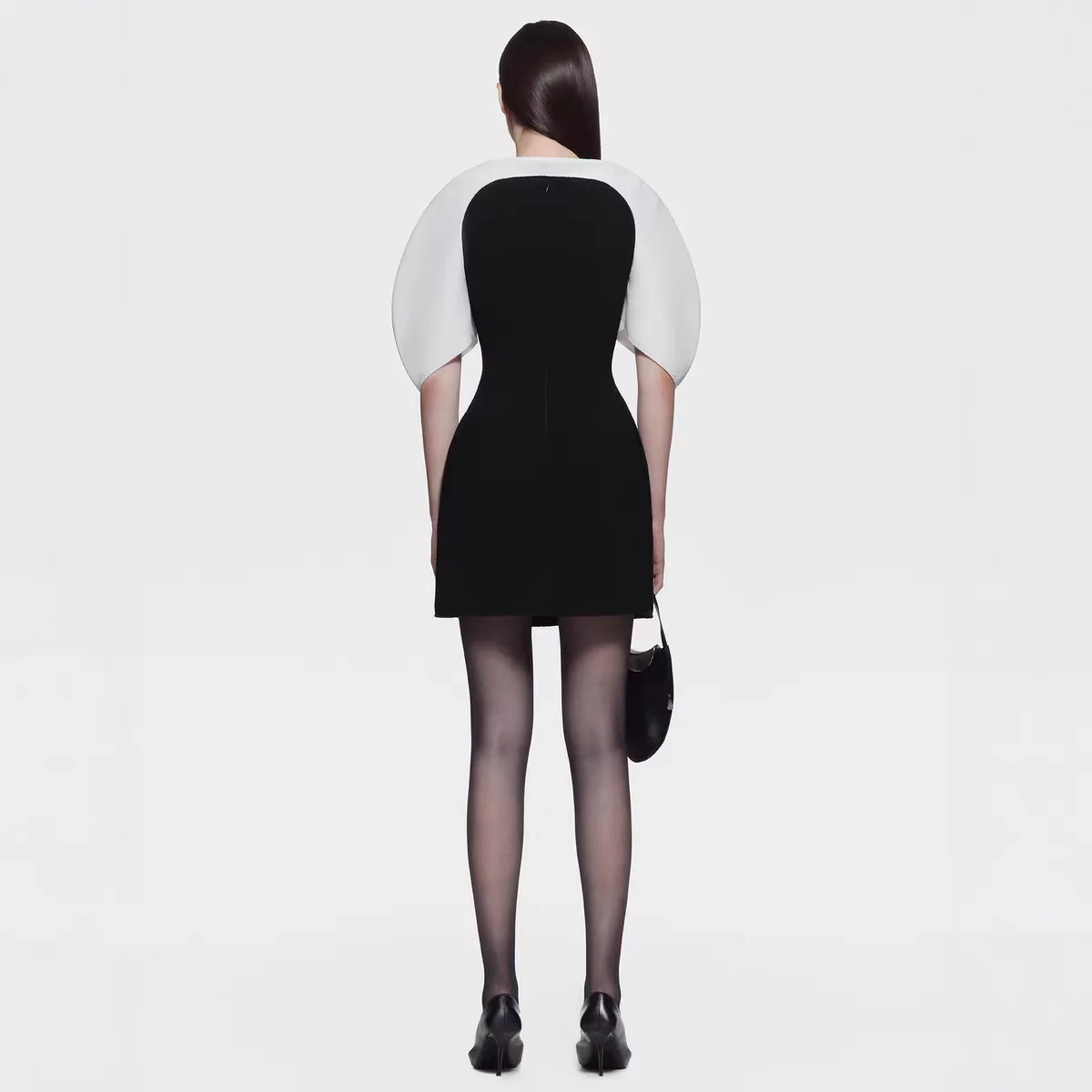 New Stock Arrival High-Quality Women's Black and White Color Block Puff Sleeve Short Dress Elegant Slim Fit Party Dress