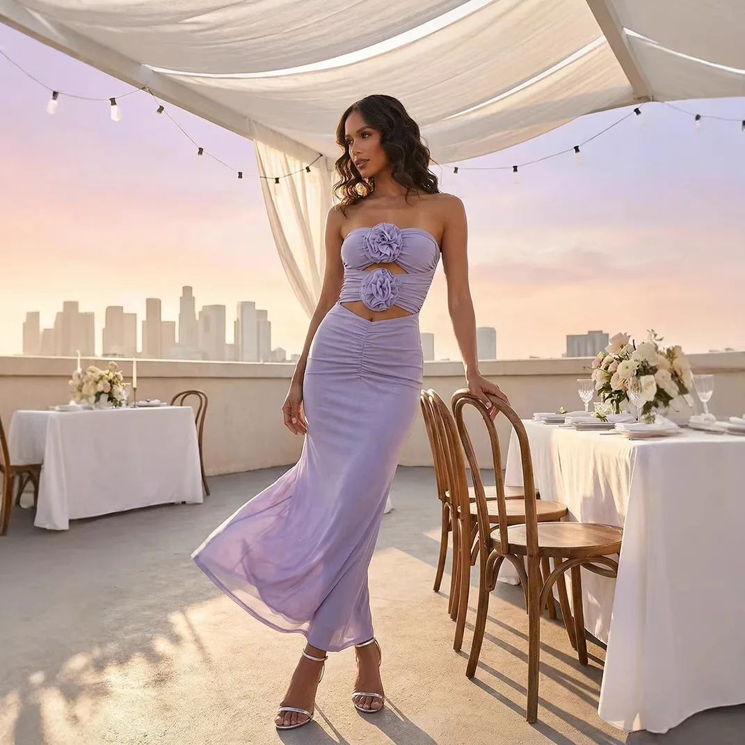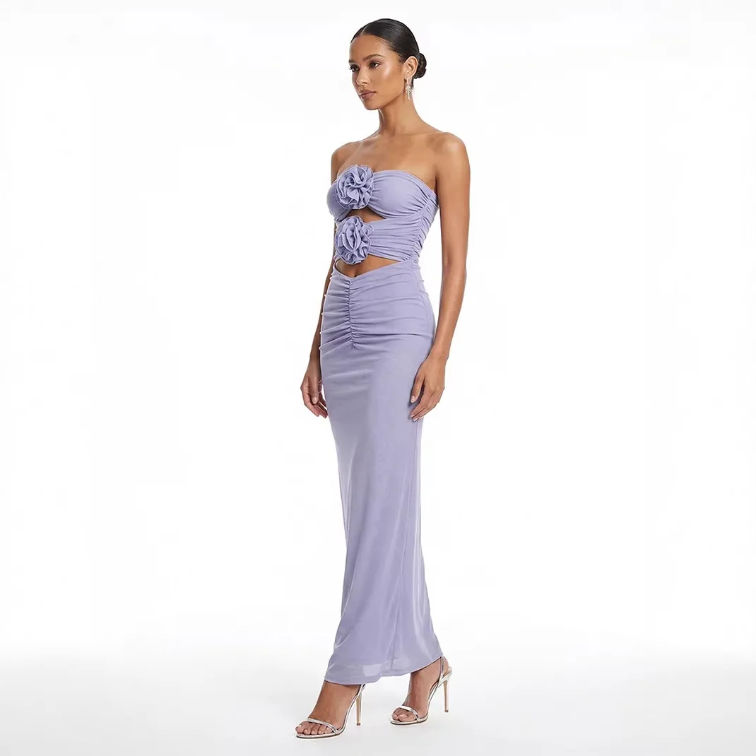 High-quality Women's Fashion purple Strapless Floral Sexy Hollowed-out Mesh Long Dress for Evening Party