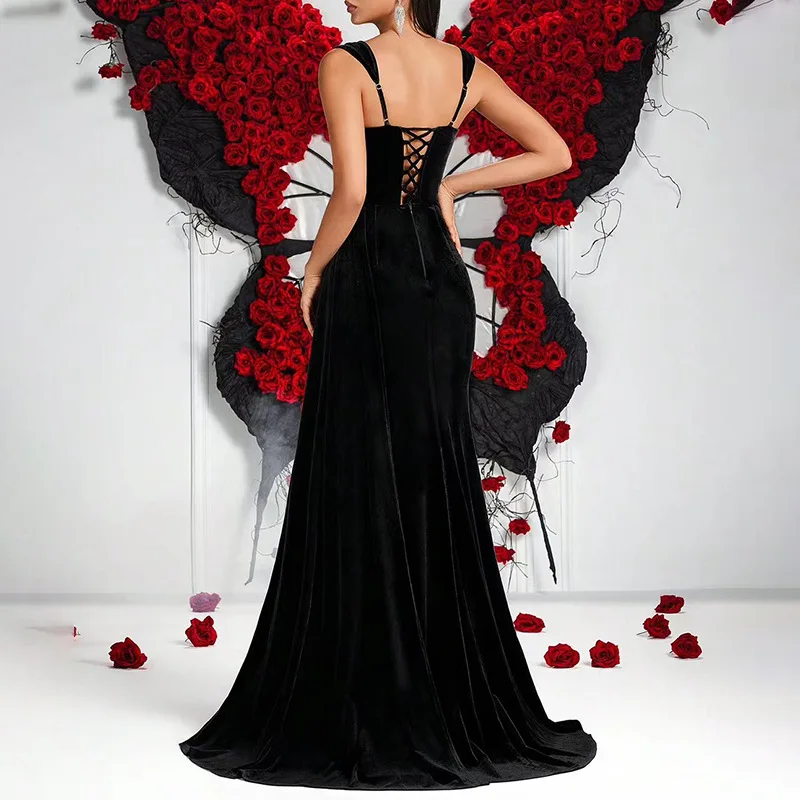 New Stock Arrival Sexy Dress Autumn Winter New Style Black Elegant Rhinestone Patchwork Spaghetti Strap Slim Fit Evening Dress