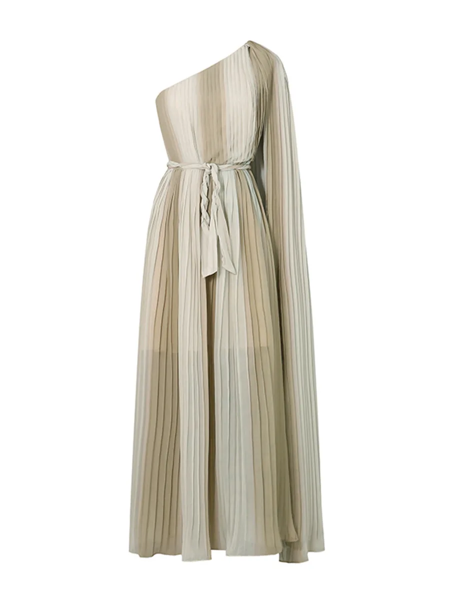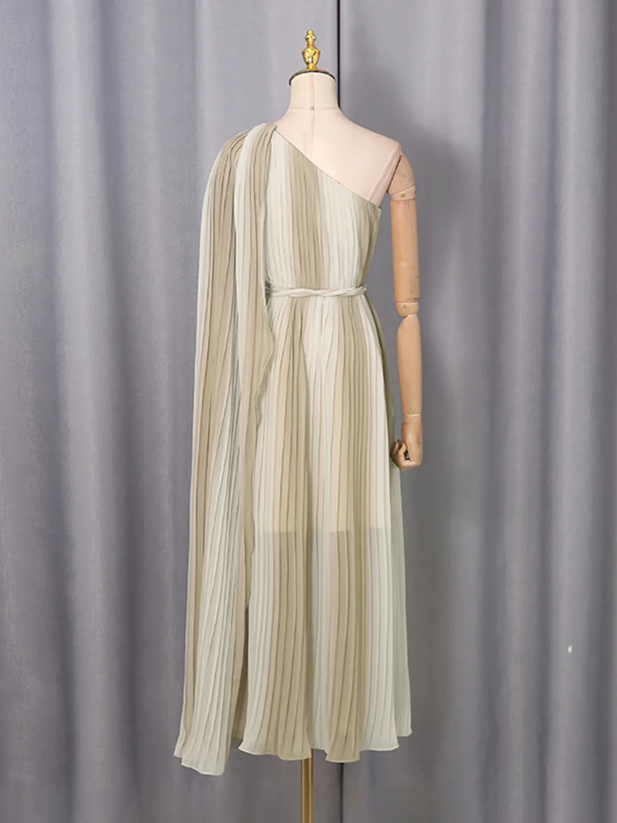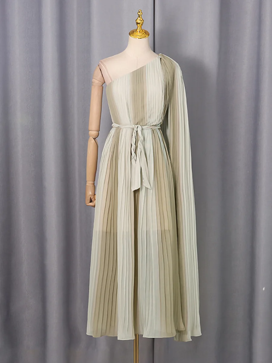 Bettergirl High-quality New Design Shawl Sleeve Dress New Fashion One-shoulder Tie-waist Pleated Midi Dress