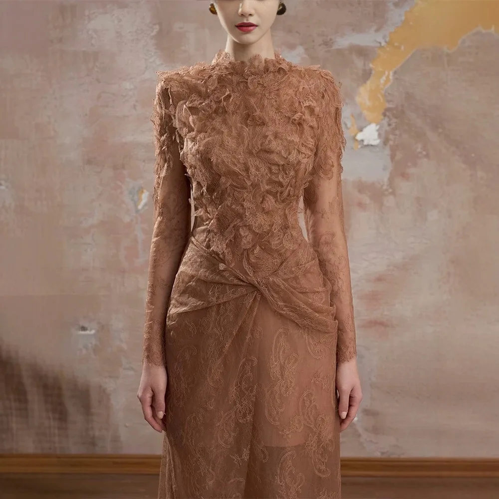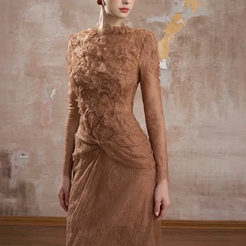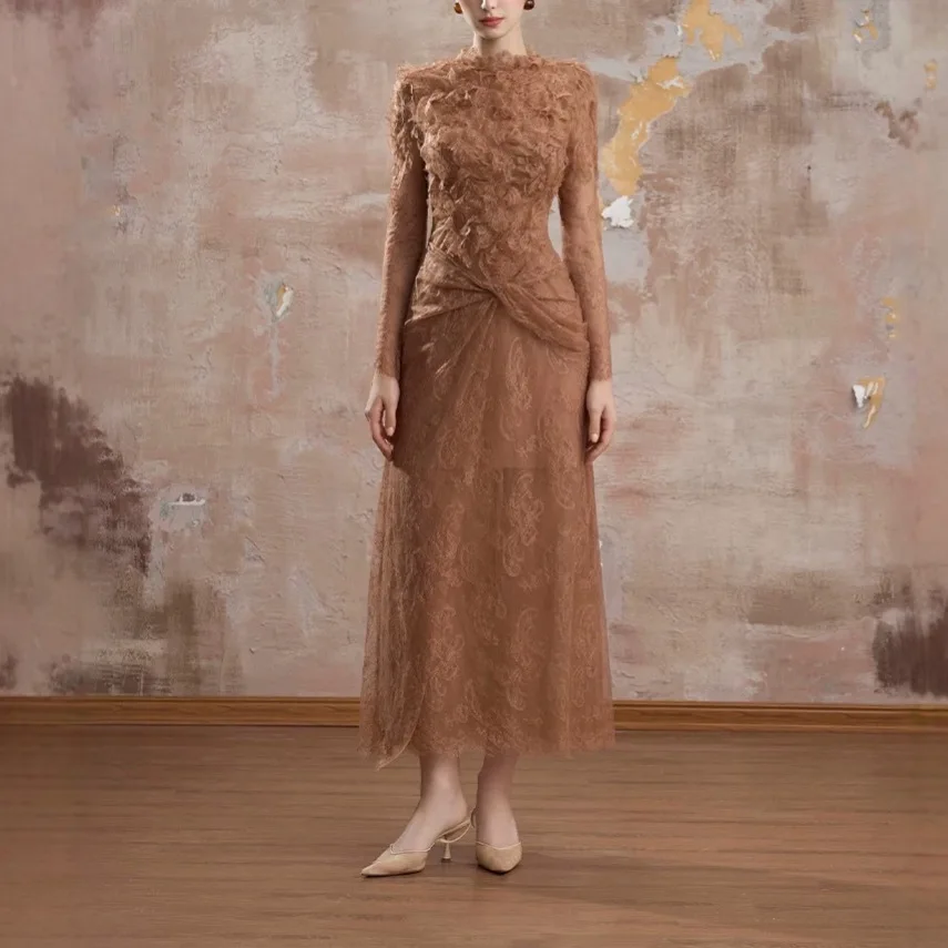 ZYHT 21541 Wholesale Crew Neck High Waist Casual Dresses Elegant Lace Velvet Mermaid Hem Ruched Long Sleeve Dresses for Women