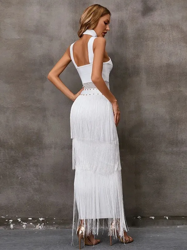 Bettergirl 2026 Spring Fashion Tassels Halter White Long Dress Sexy Bandage Evening Dress