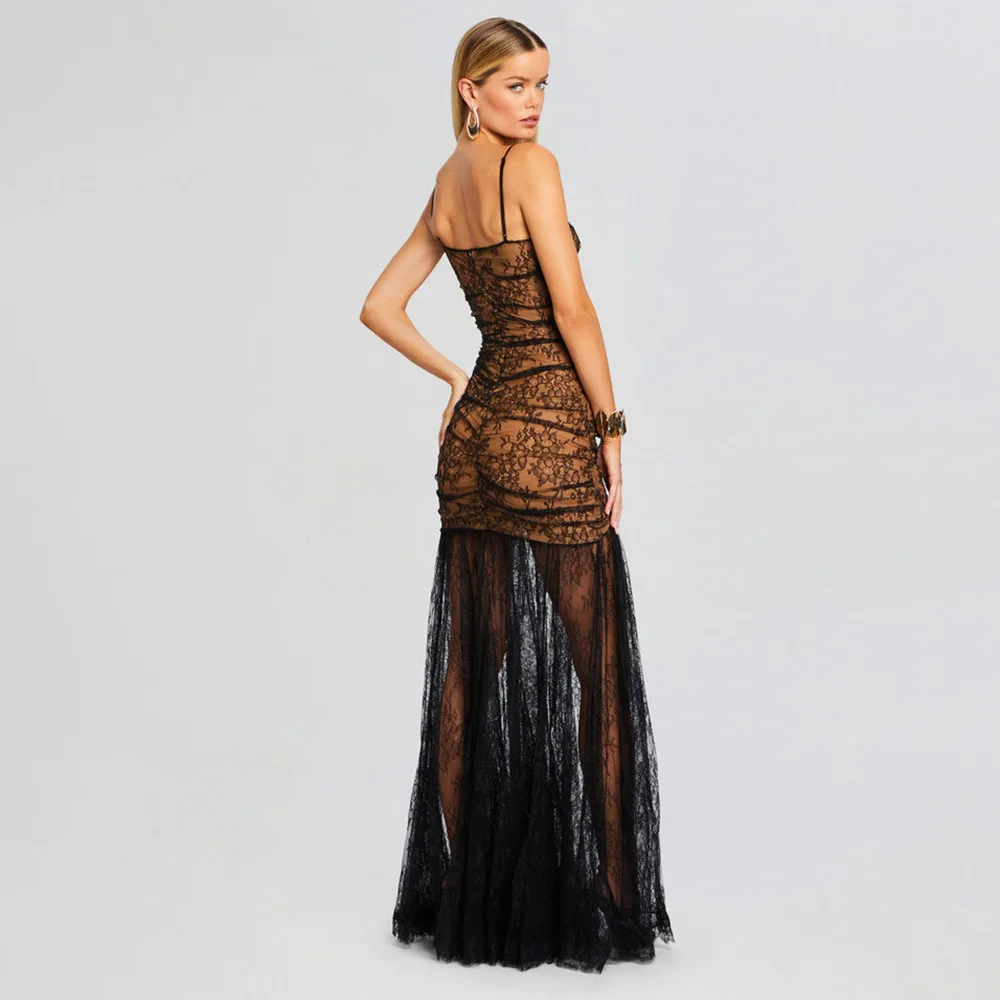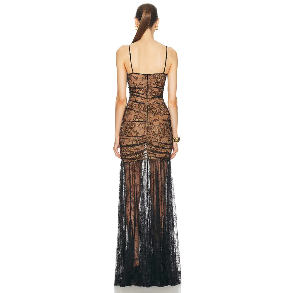 2024 Fashion New Black Pleated Lace Long Halter Evening Dresses Patchwork Sexy Sheath Women Dress