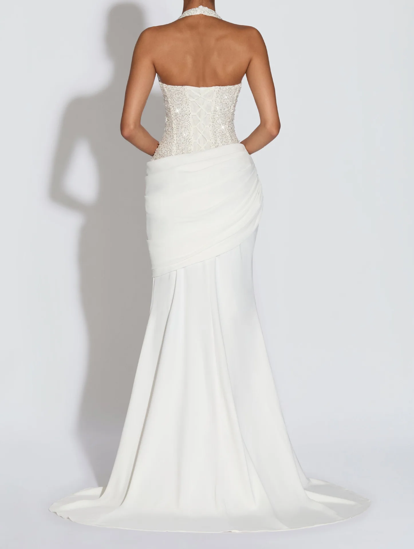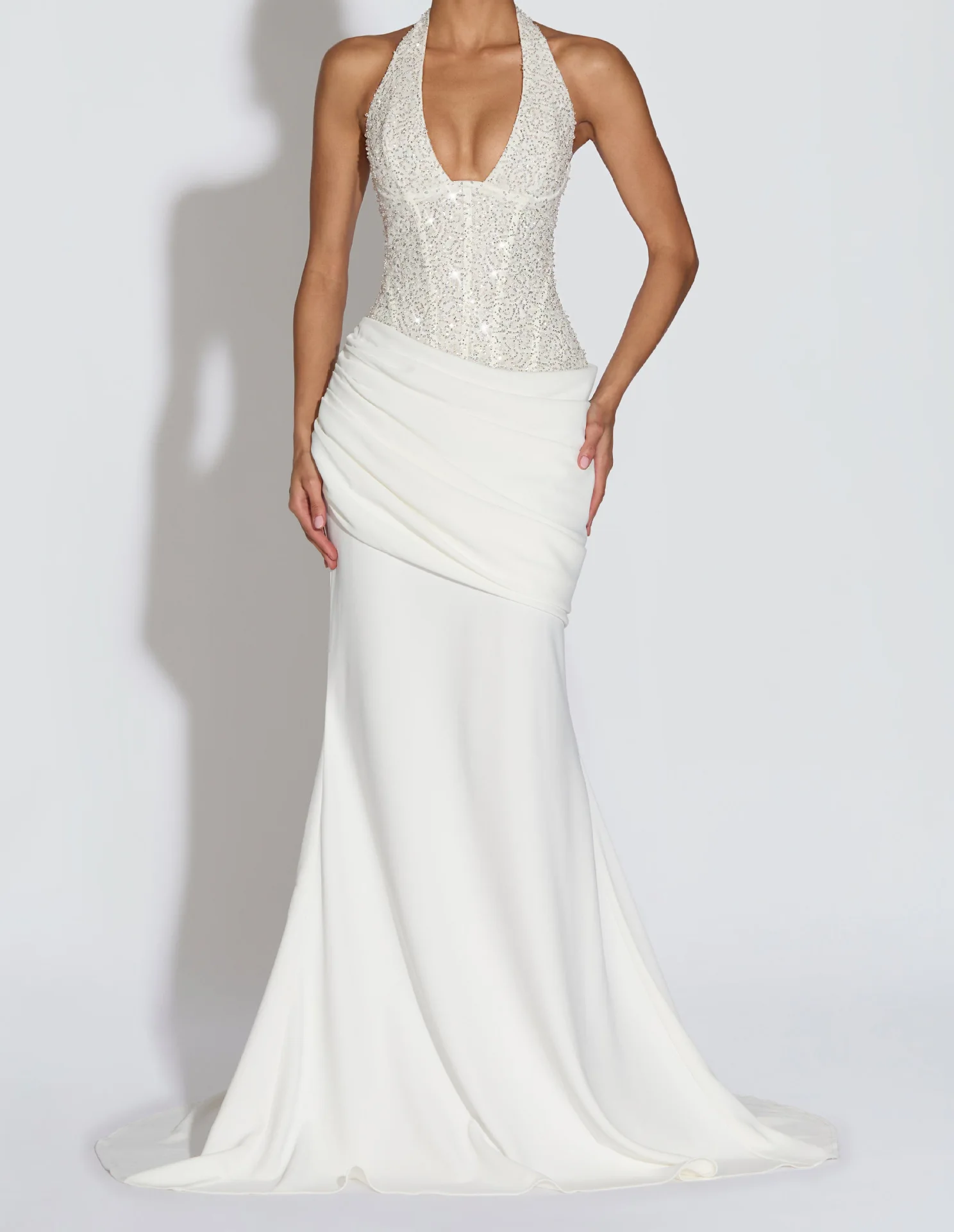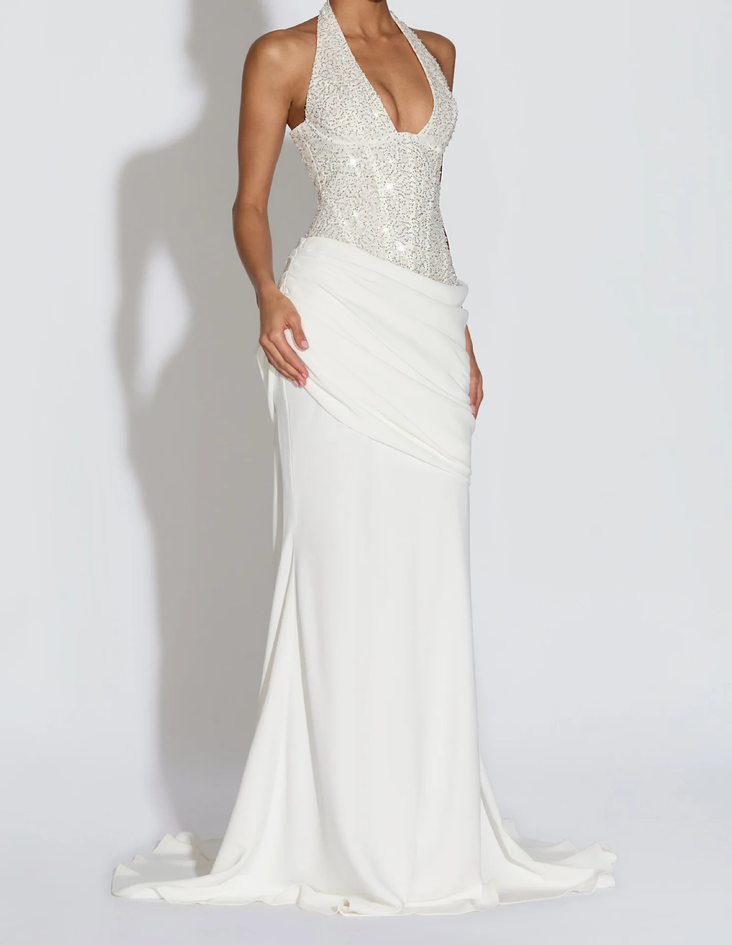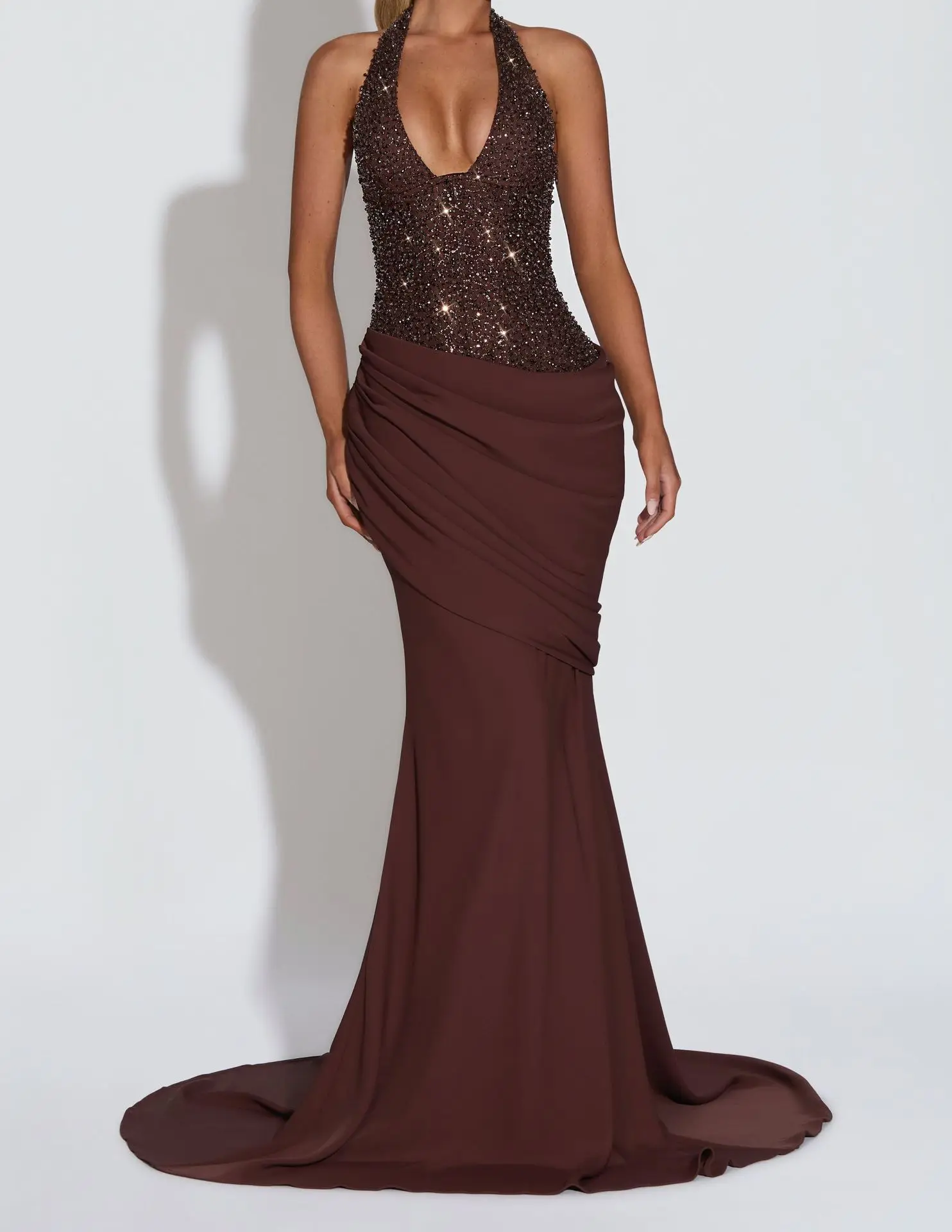 ZYHT 73907 Custom Design Long Sleeve High Neck Fashion Pleated Crystal Beads Ruched Knot High Slit Sexy Luxury Evening Dress