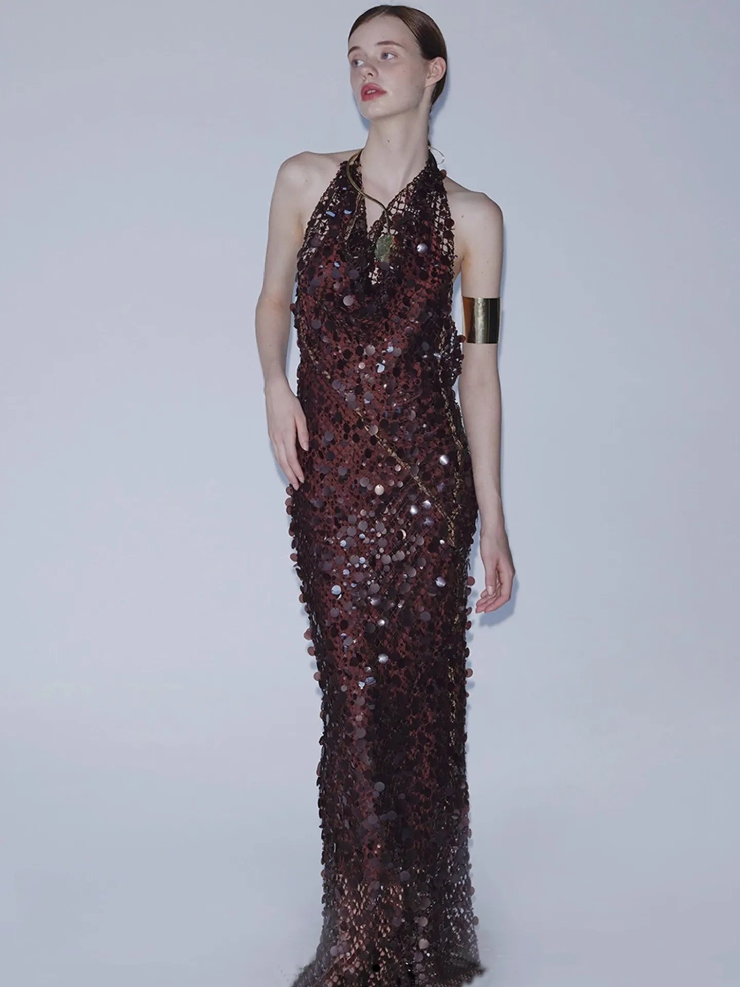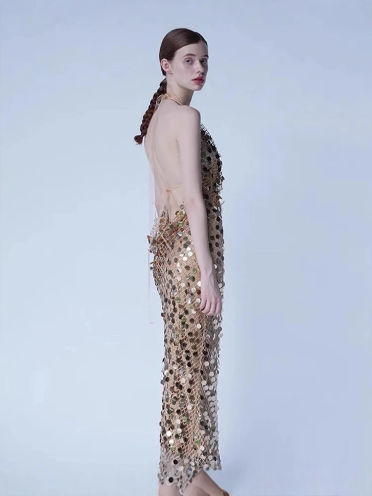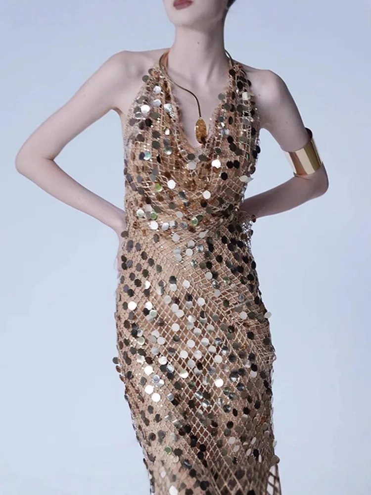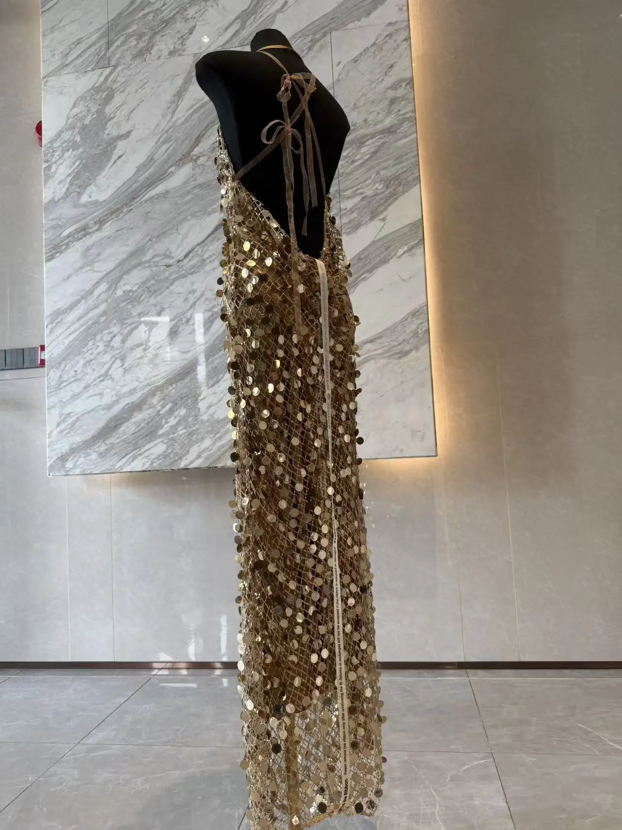 Bettergirl Spring 2026 New Mesh Sequin V-neck Halter Golden Long Dress Backless Luxury Birthday Party Elegant Evening Dress