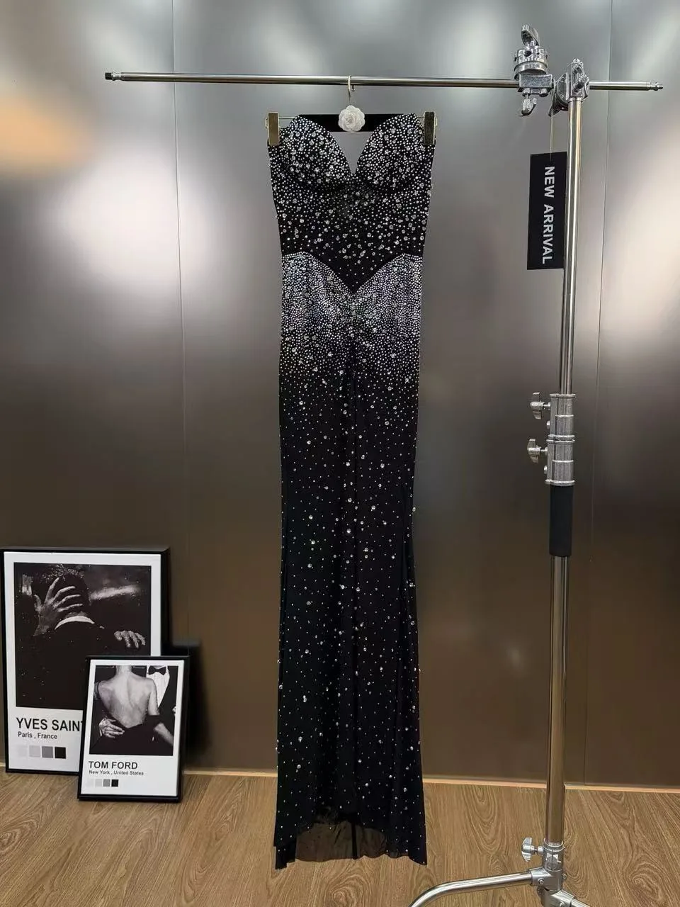 ZYHT 73903 Gemstone Crystal 3D Flower Decoration Ruched One Shoulder High Slit Long Sleeve Maxi Simple Elegant Evening Dress