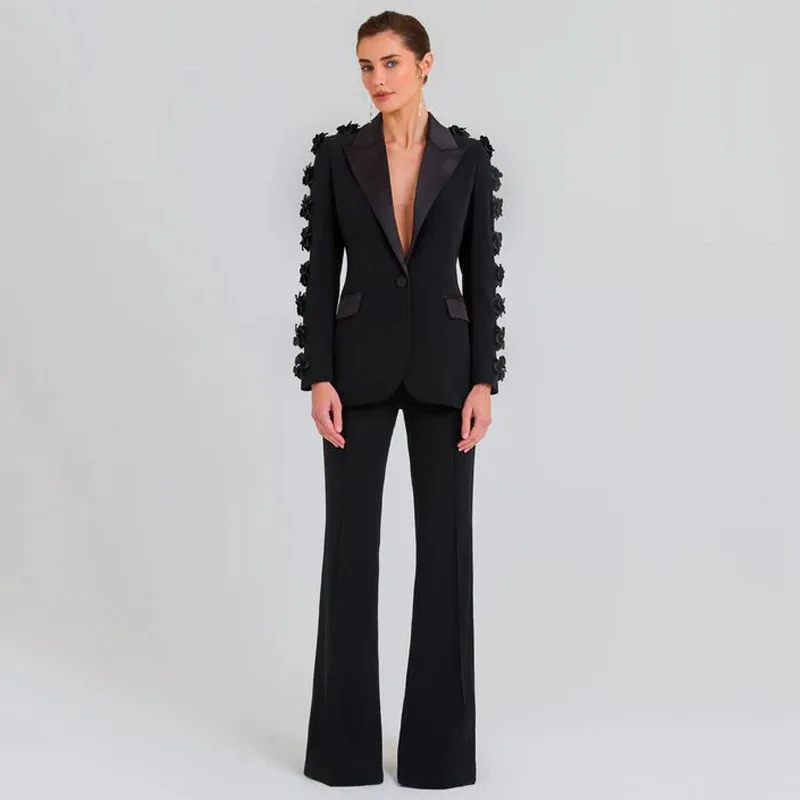 Fashion Luxury 2025 V Neck 3D Flower Black Women's Coats Women's Party Evening Gown Long Straight Pants Women's Suit