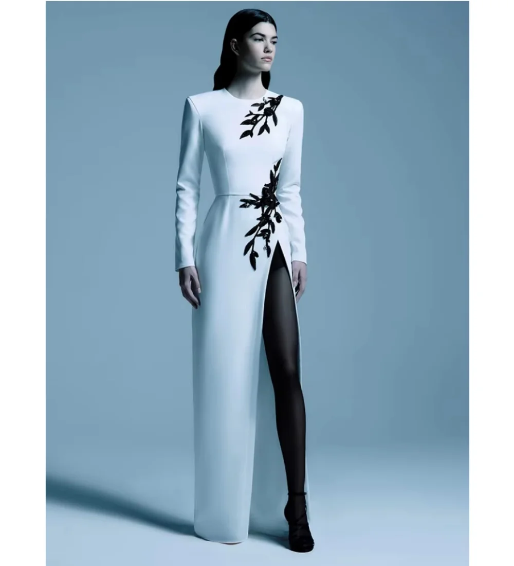 ZYHT 15325 Wholesale Spring Trendy Fashion Long Sleeve Dinner White Lace Black Velvet Elegant Party Dress Women Evening Dresses