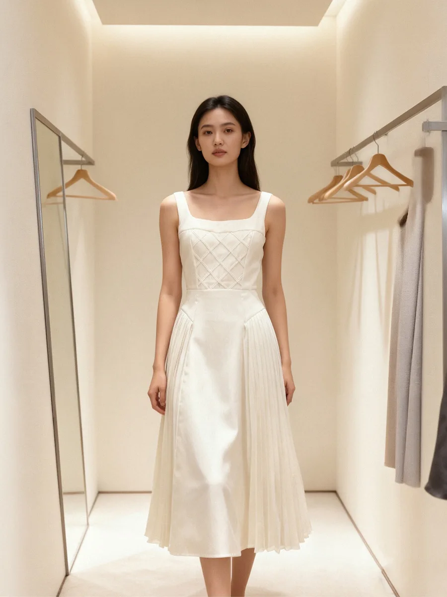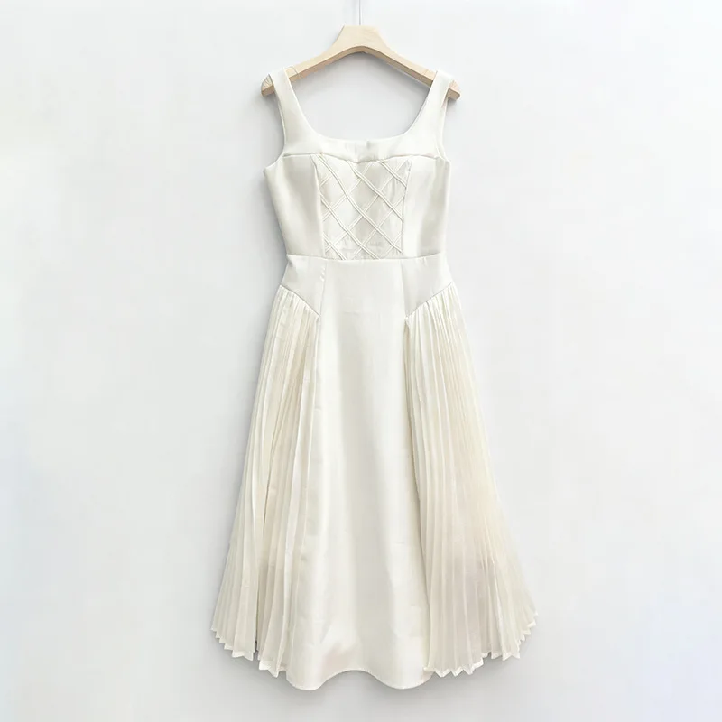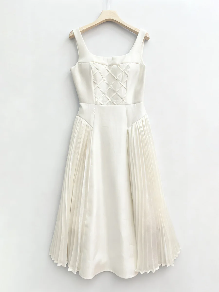High Quality Wholesale New Arrival White Camisole Pleated Trim Square Neckline Dress for Daily