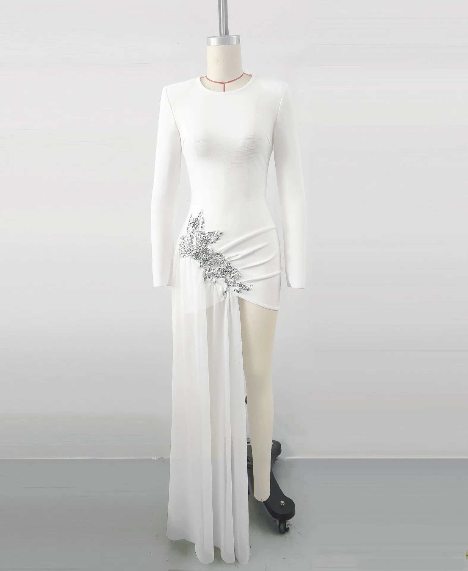 ZYHT 73903 Gemstone Crystal 3D Flower Decoration Ruched One Shoulder High Slit Long Sleeve Maxi Simple Elegant Evening Dress