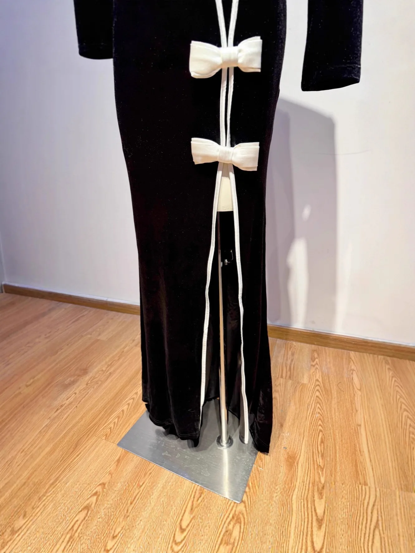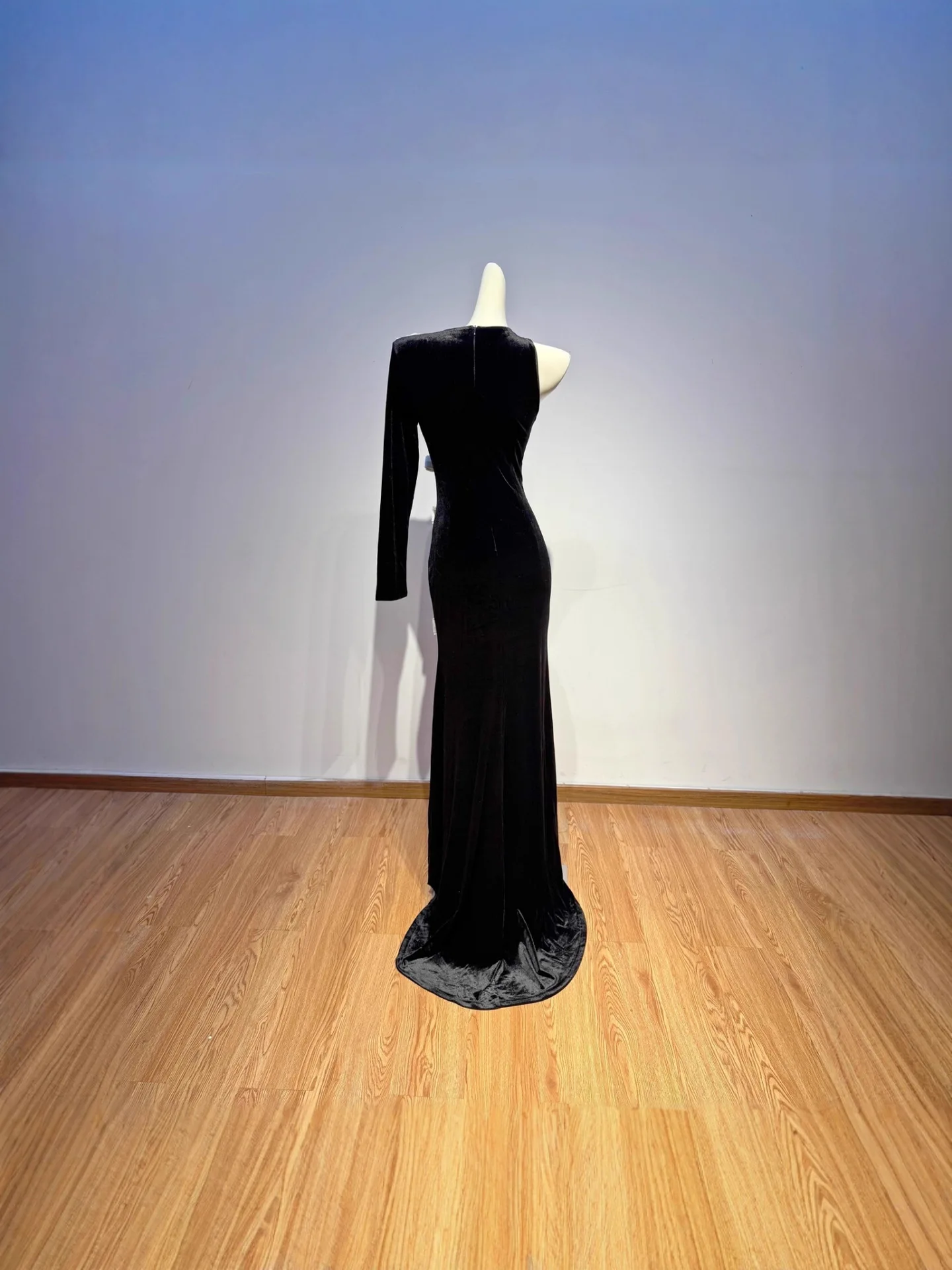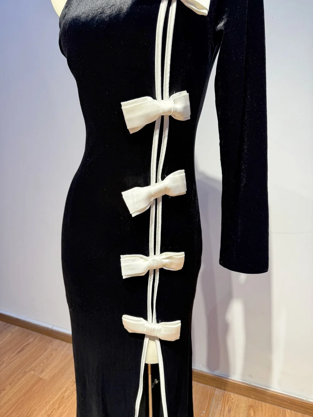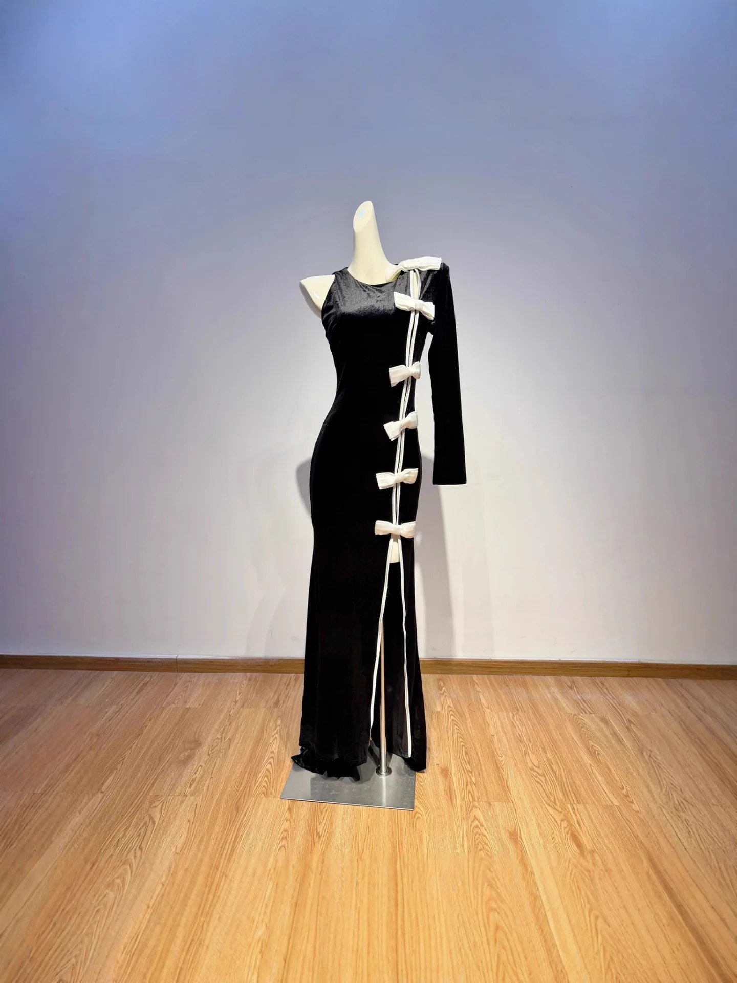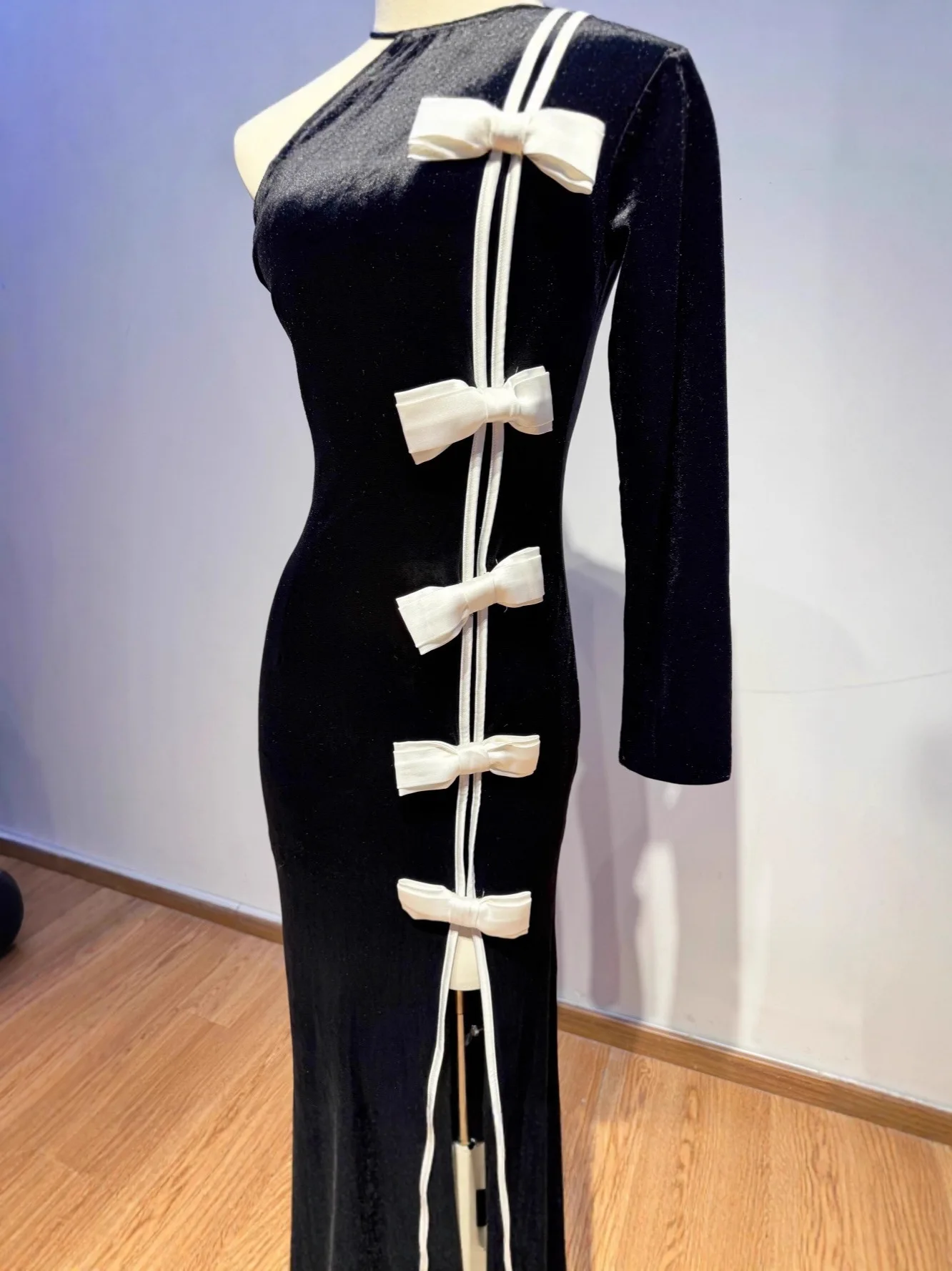Women Velvet One Shoulder Evening Party Gown High Slit With White Bow Fitted Fishtail Vintage Long Dress