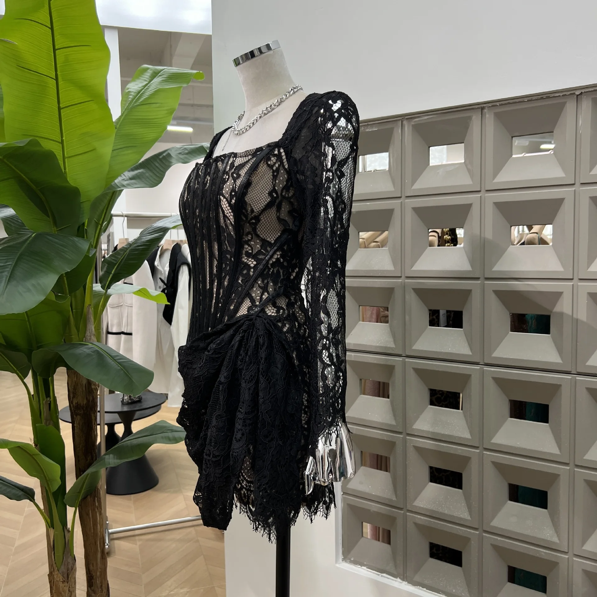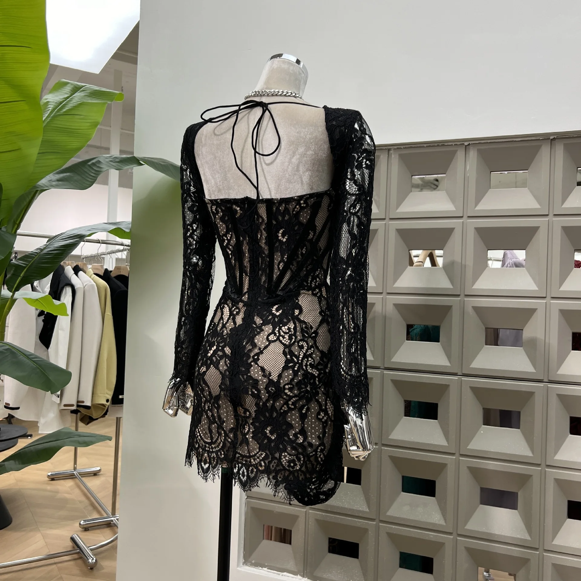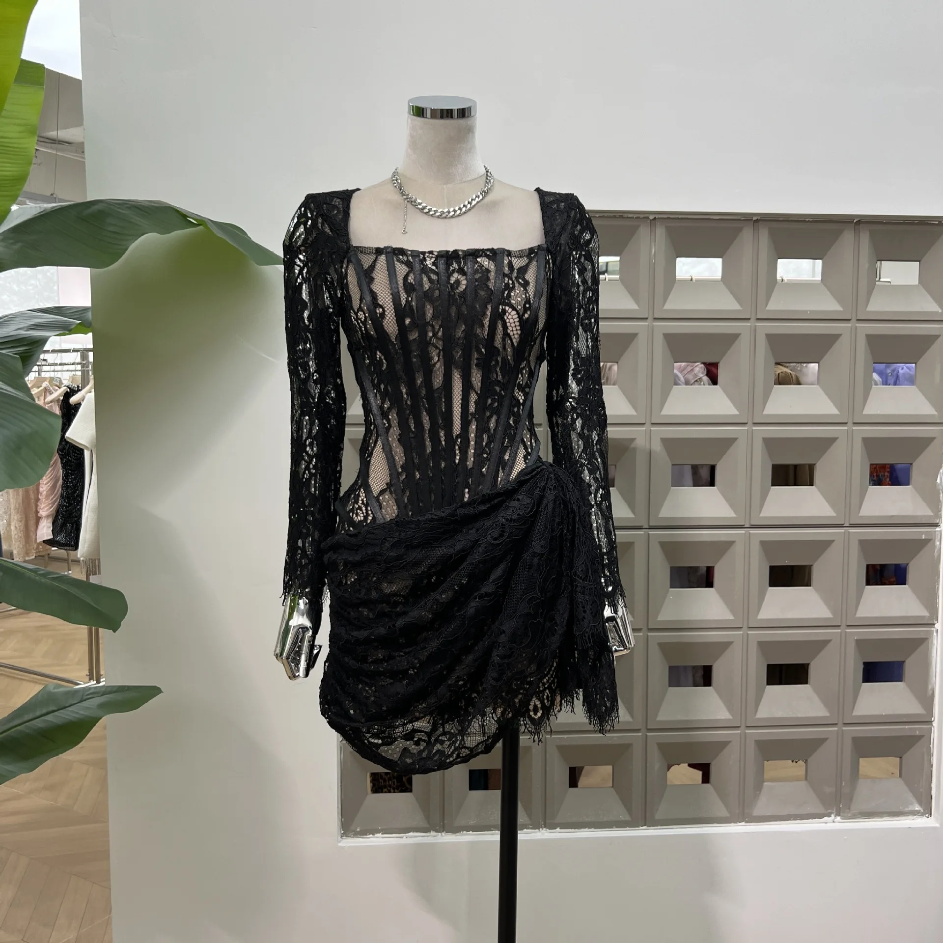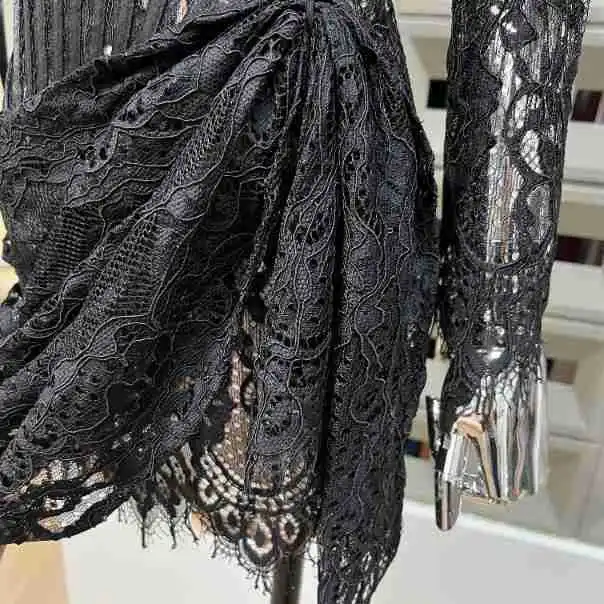 ZYHT 21541 Wholesale Crew Neck High Waist Casual Dresses Elegant Lace Velvet Mermaid Hem Ruched Long Sleeve Dresses for Women