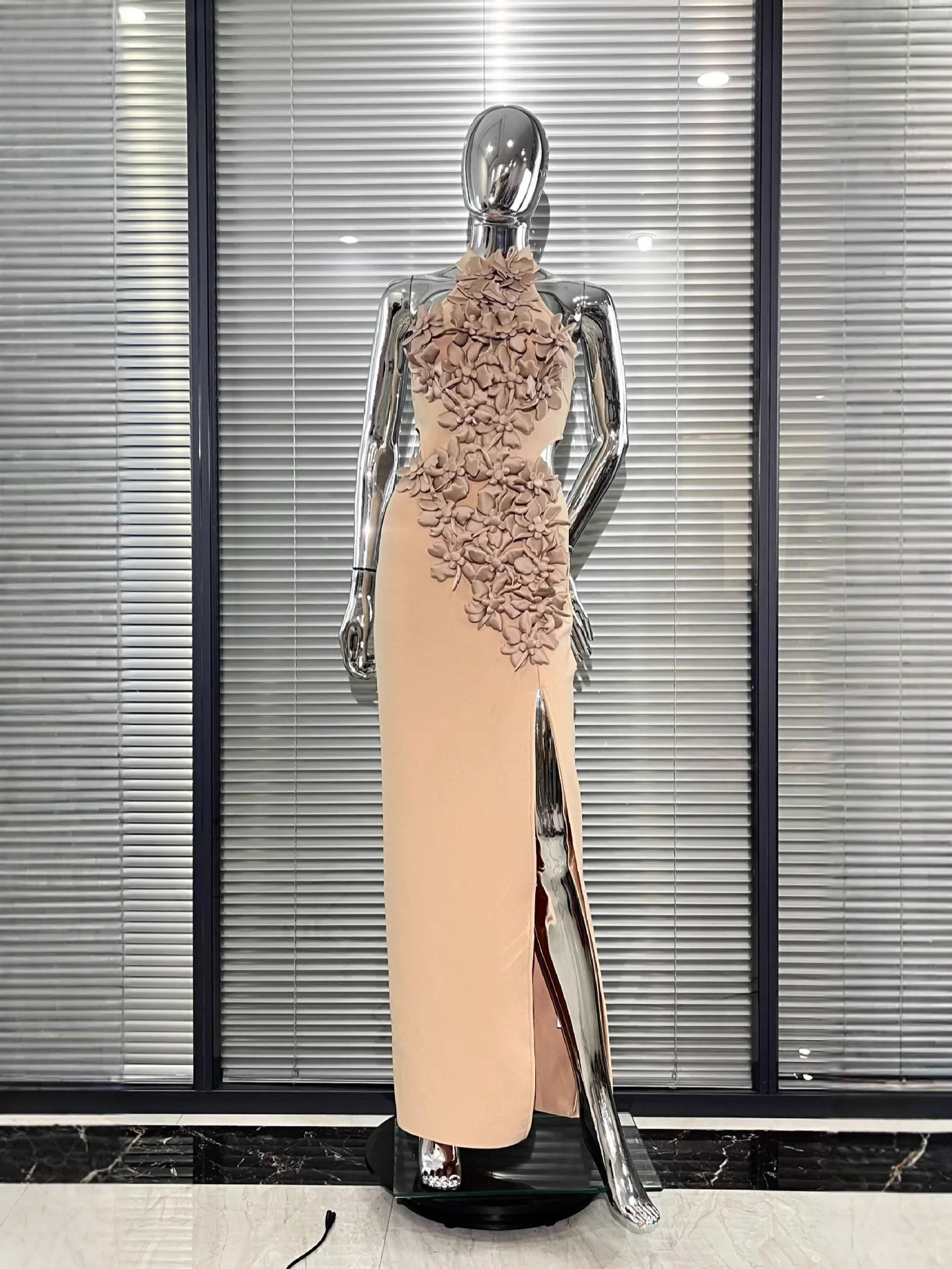 ZYHT 73903 Gemstone Crystal 3D Flower Decoration Ruched One Shoulder High Slit Long Sleeve Maxi Simple Elegant Evening Dress