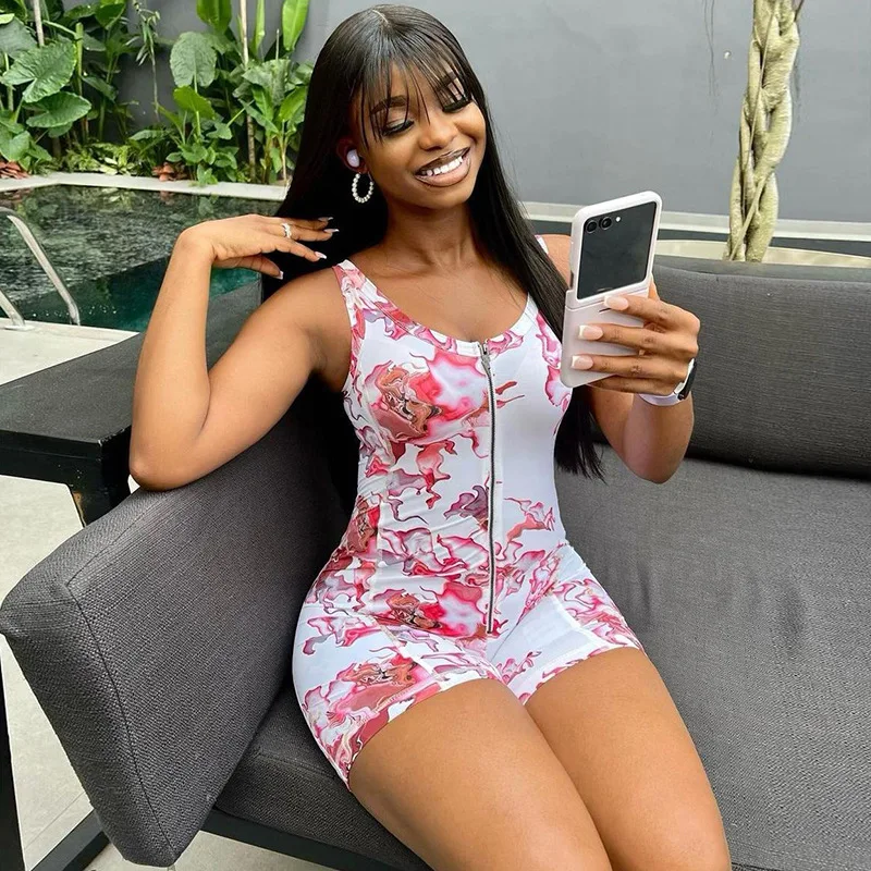 K24Q44690 Vintage Crew Neck Women's Sportswear Bodycon Zip One Piece Short Jumpsuit Fitness Woman Print Romper