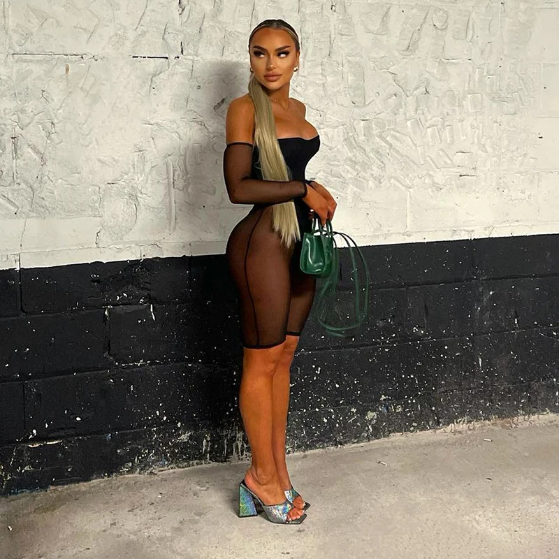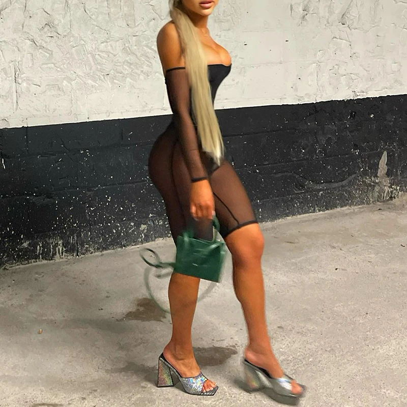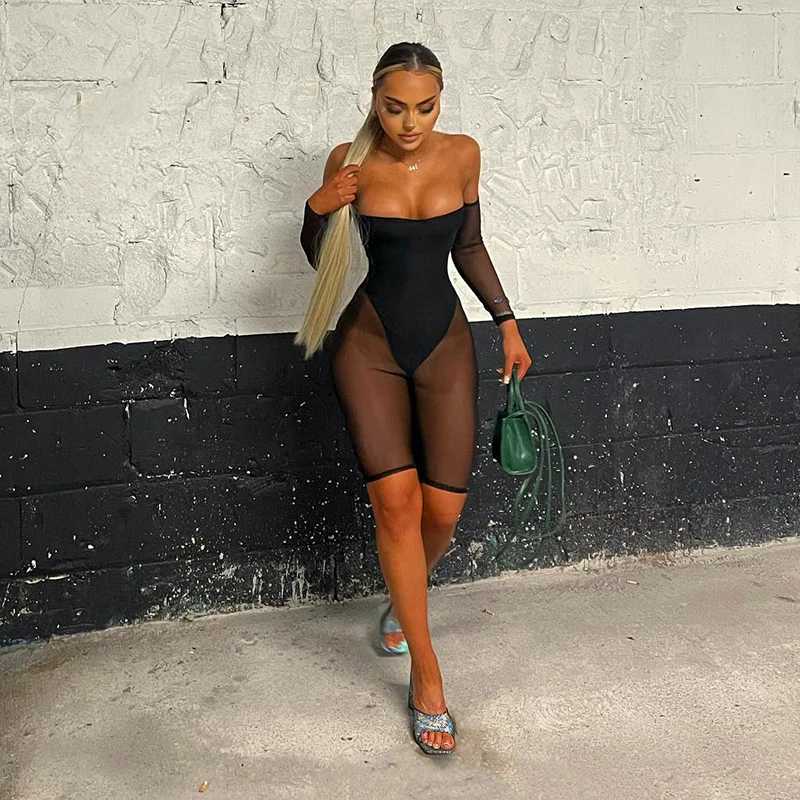 Summer 2023 New Solid Color Long Sleeve Stitching Mesh Shorts Jumpsuit Casual Pants Women Lady